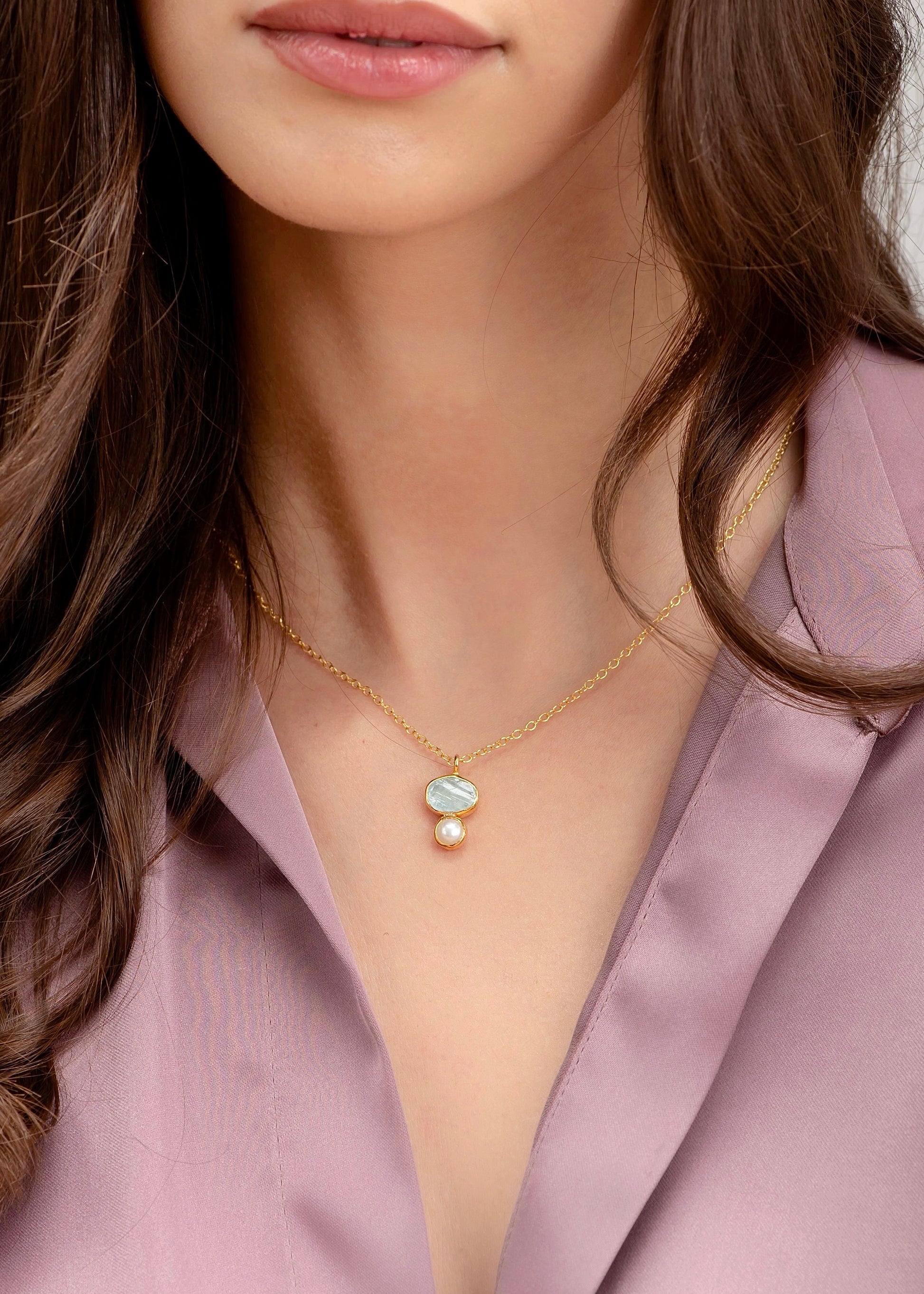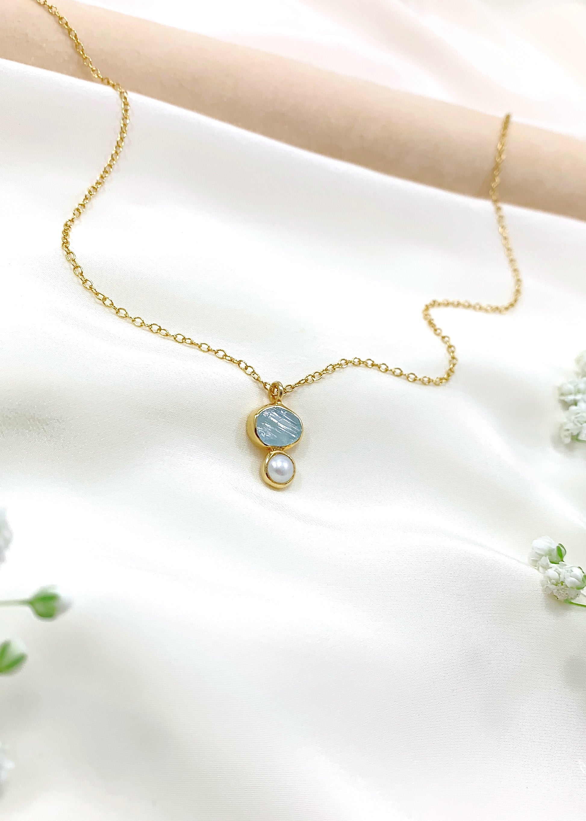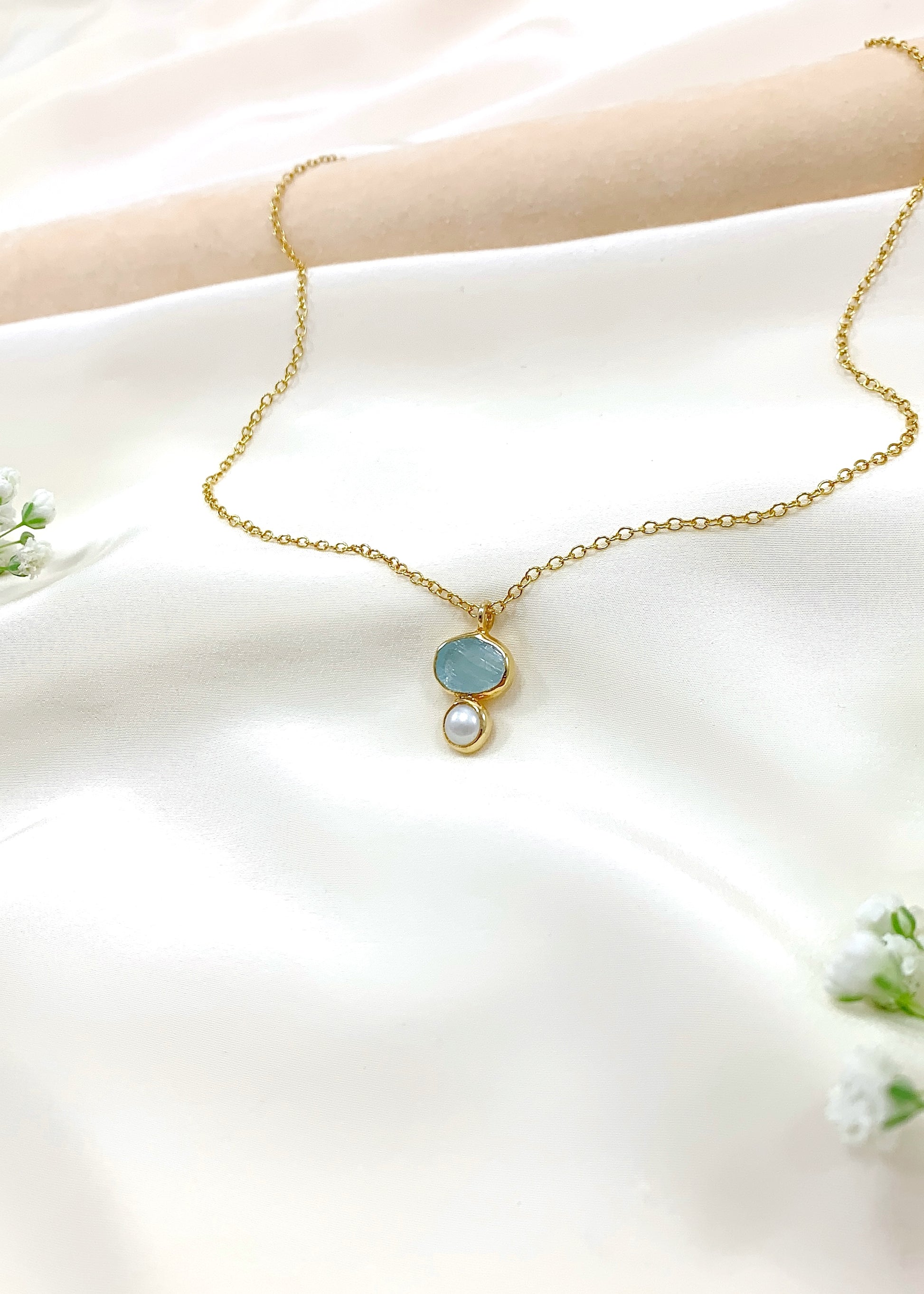 Η ακουαμαρίνα συνδέεται με διαύγεια και ψυχική σταθερότητα, ενώ το μαργαριτάρι, καρπός υπομονής και φυσικής τελειότητας, φέρει ενέργεια που εμπνέει σιγουριά και εσωτερική γαλήνη. Μαζί, δημιουργούν μια σύνθεση που αντανακλά καθαρότητα σκέψης και αυτοπεποίθηση.