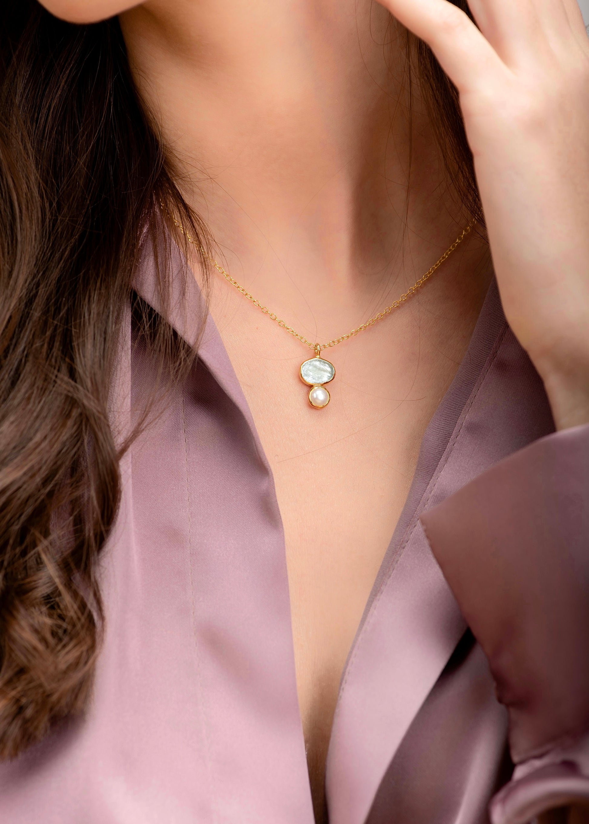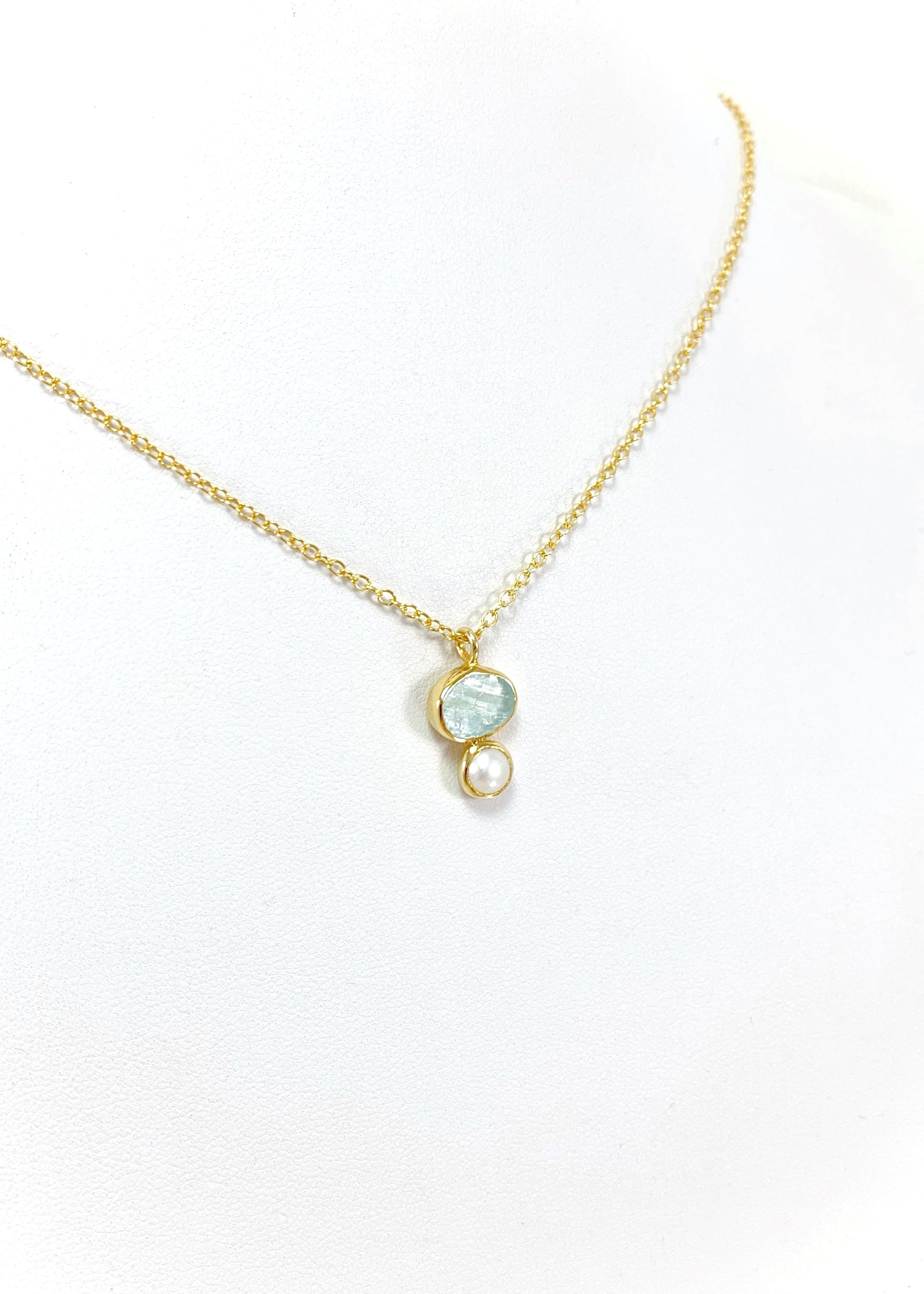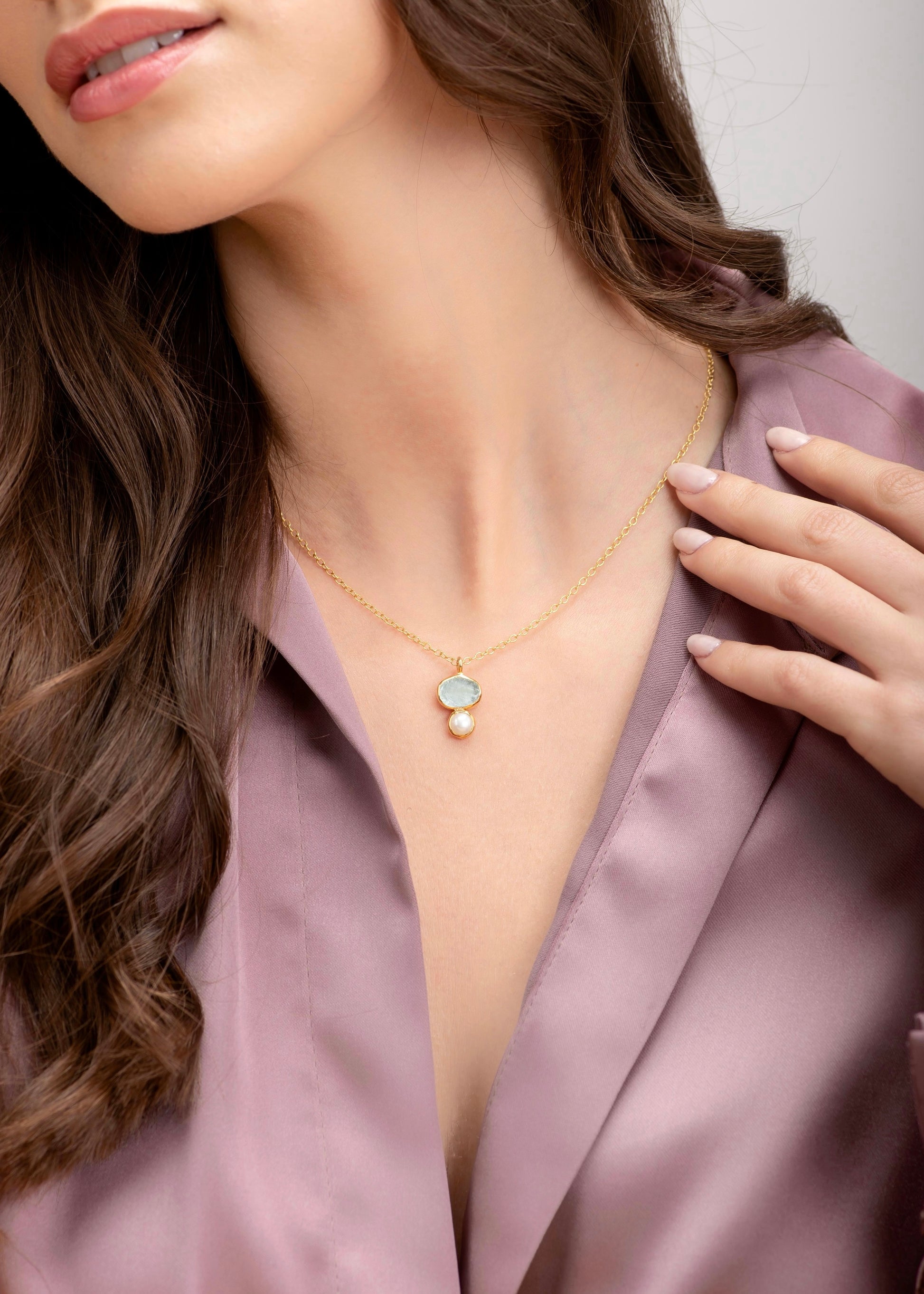 Η ακουαμαρίνα συνδέεται με διαύγεια και ψυχική σταθερότητα, ενώ το μαργαριτάρι, καρπός υπομονής και φυσικής τελειότητας, φέρει ενέργεια που εμπνέει σιγουριά και εσωτερική γαλήνη. Μαζί, δημιουργούν μια σύνθεση που αντανακλά καθαρότητα σκέψης και αυτοπεποίθηση.
