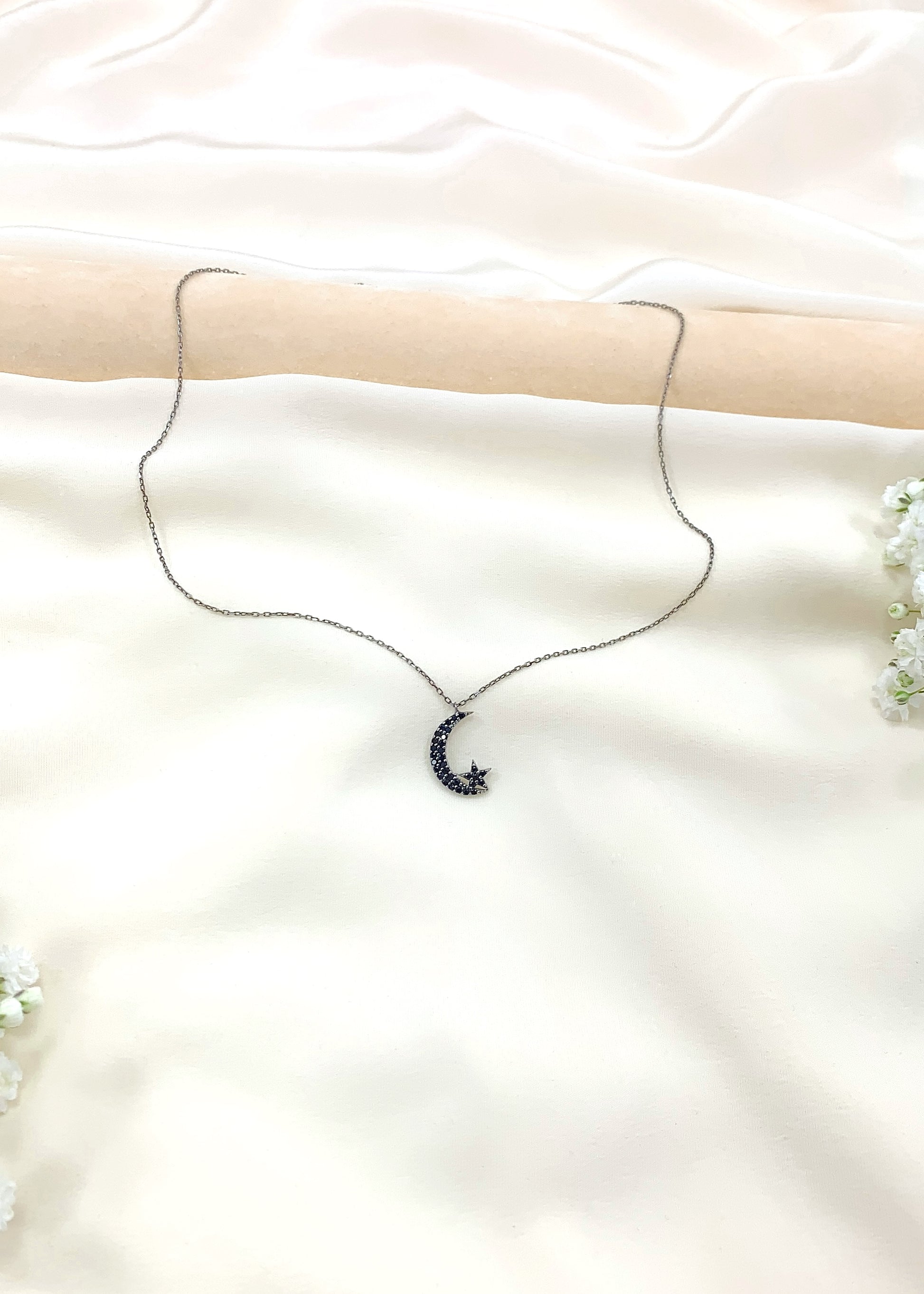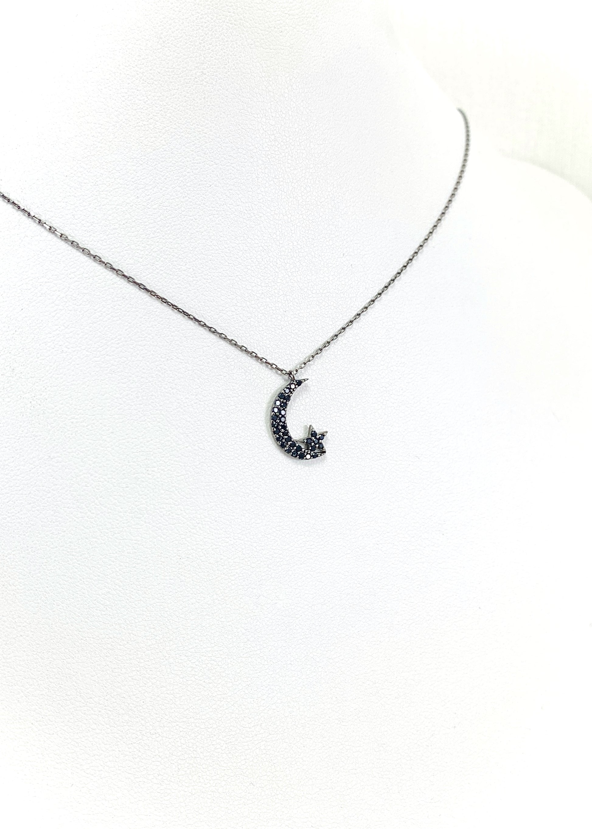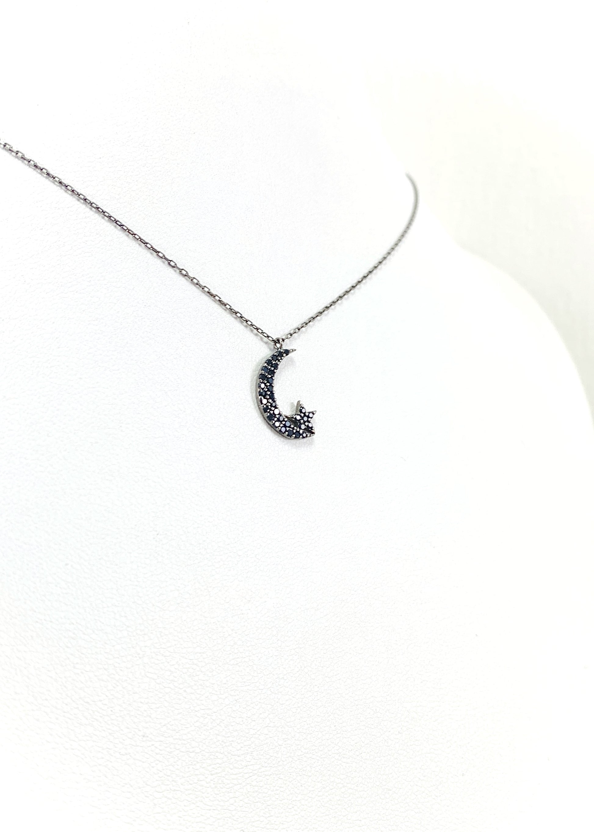 Το Alunea είναι μενταγιόν με κεντρικό μοτίφ φεγγαριού και μικρό αστέρι, διακοσμημένο με μαύρα ζιργκόν που ακολουθούν με ακρίβεια το σχήμα του σχεδίου. Η οξείδωση του μετάλλου δίνει στο κόσμημα τον χαρακτηριστικό σκούρο τόνο και καθαρό περίγραμμα.