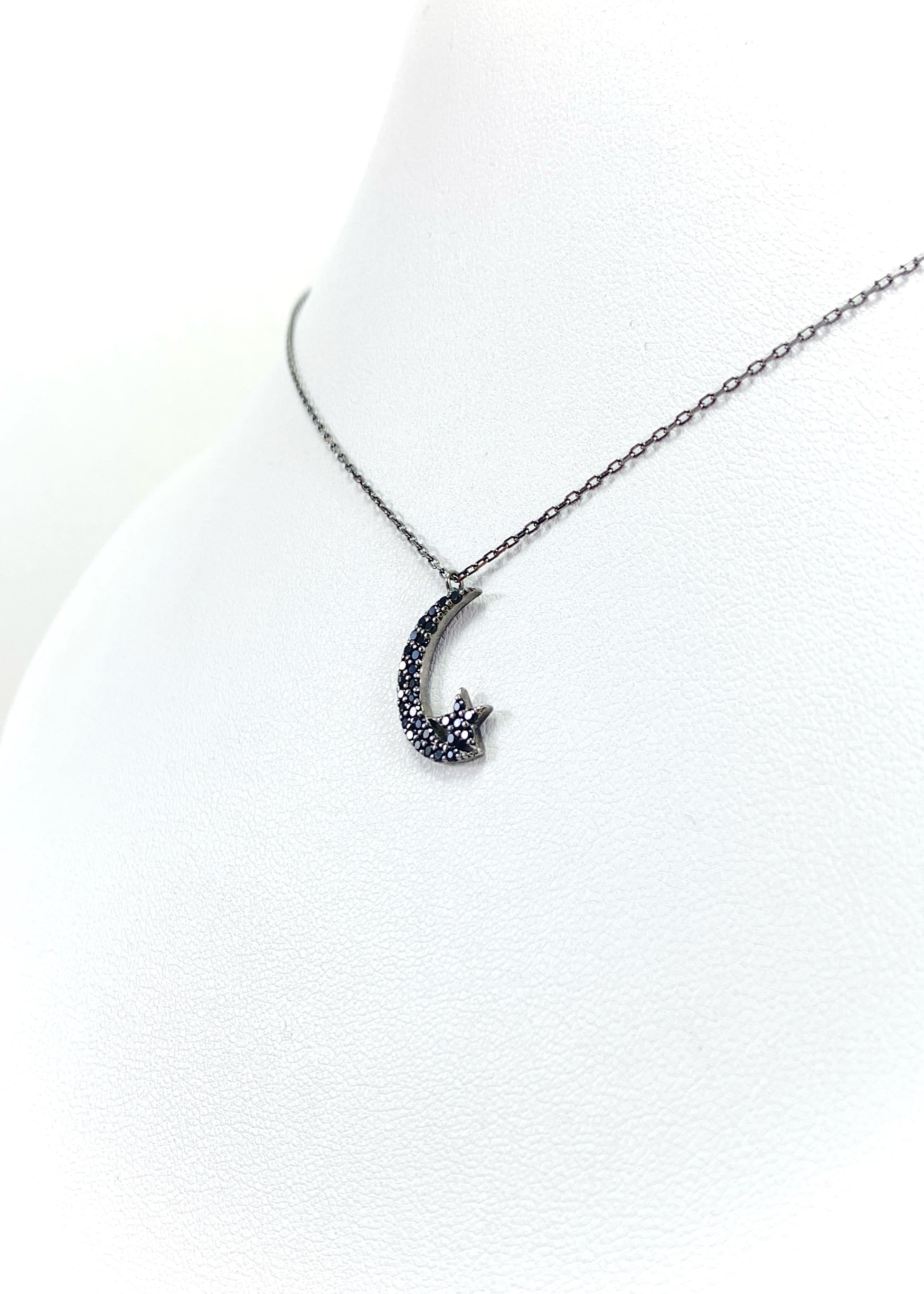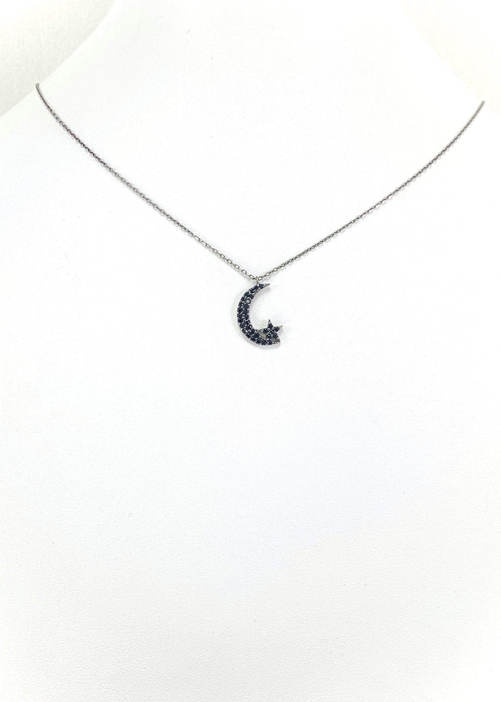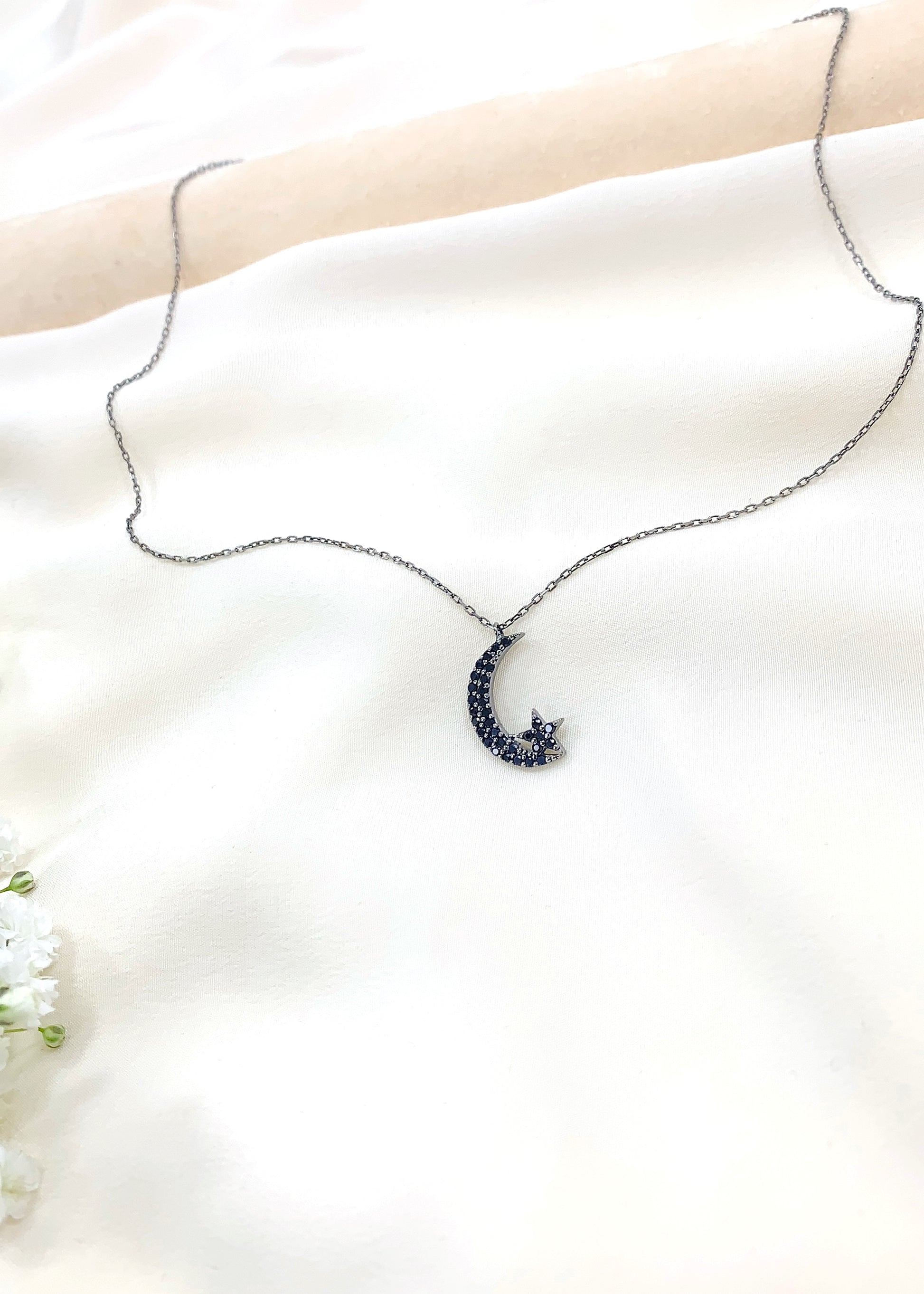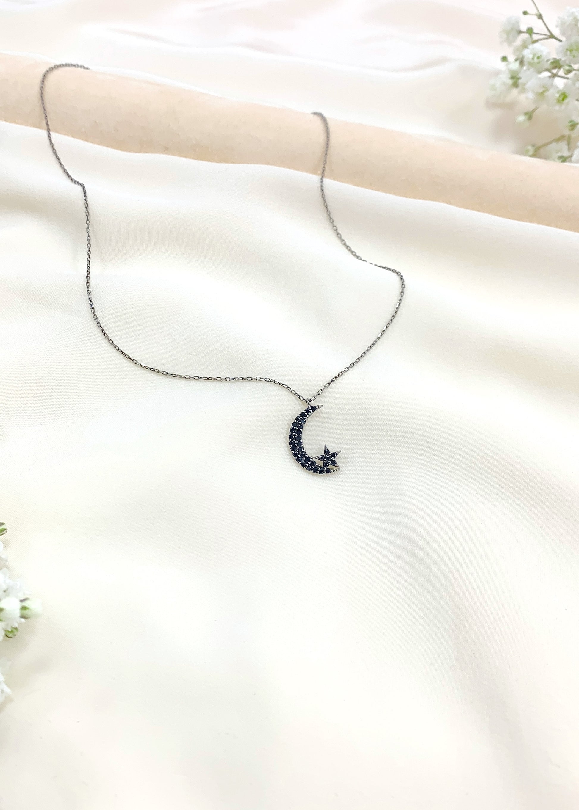 Το Alunea είναι μενταγιόν με κεντρικό μοτίφ φεγγαριού και μικρό αστέρι, διακοσμημένο με μαύρα ζιργκόν που ακολουθούν με ακρίβεια το σχήμα του σχεδίου. Η οξείδωση του μετάλλου δίνει στο κόσμημα τον χαρακτηριστικό σκούρο τόνο και καθαρό περίγραμμα.