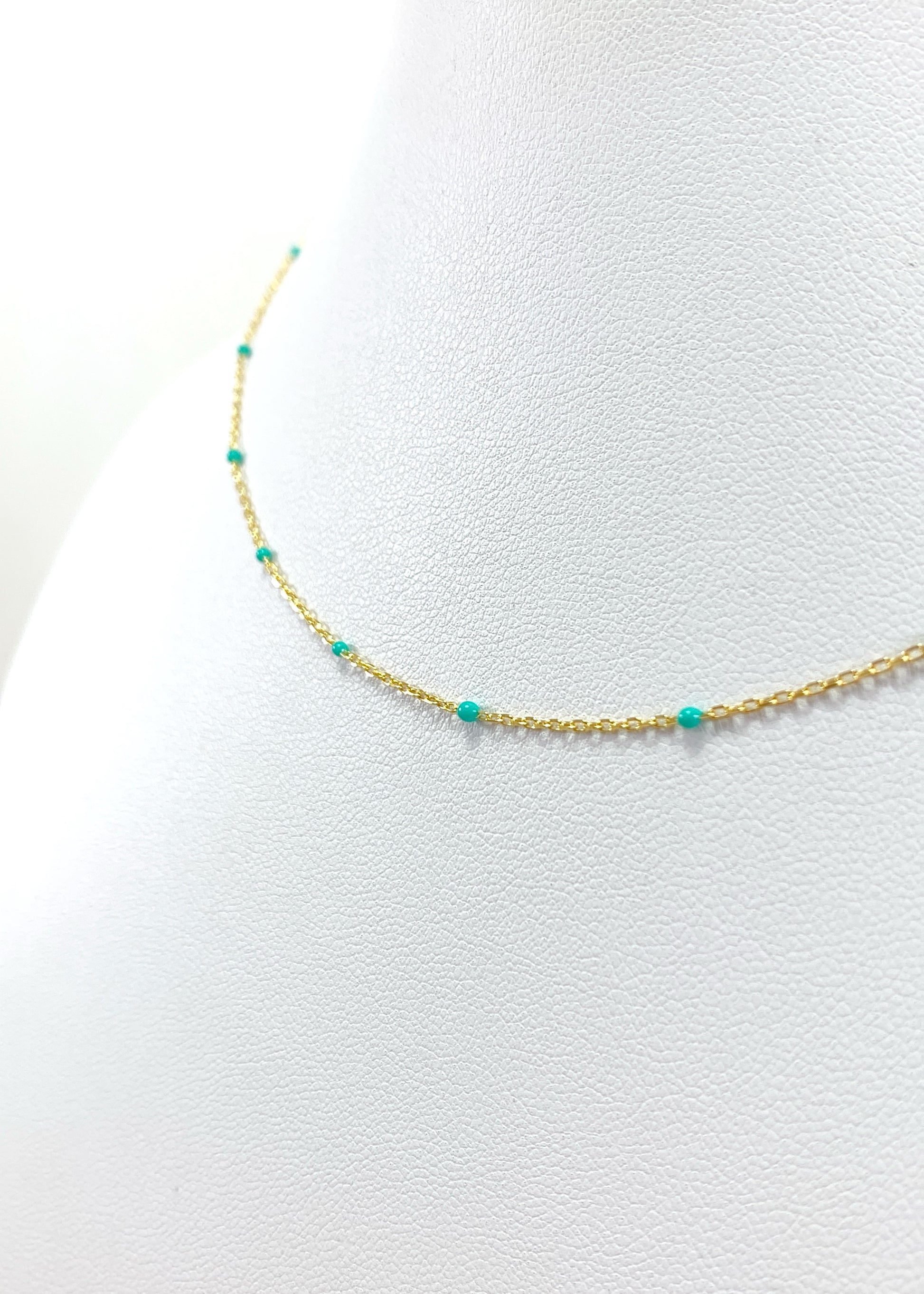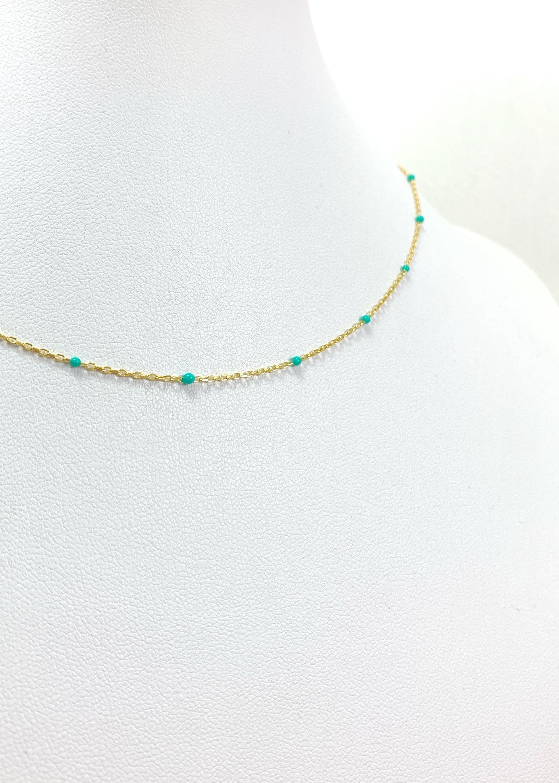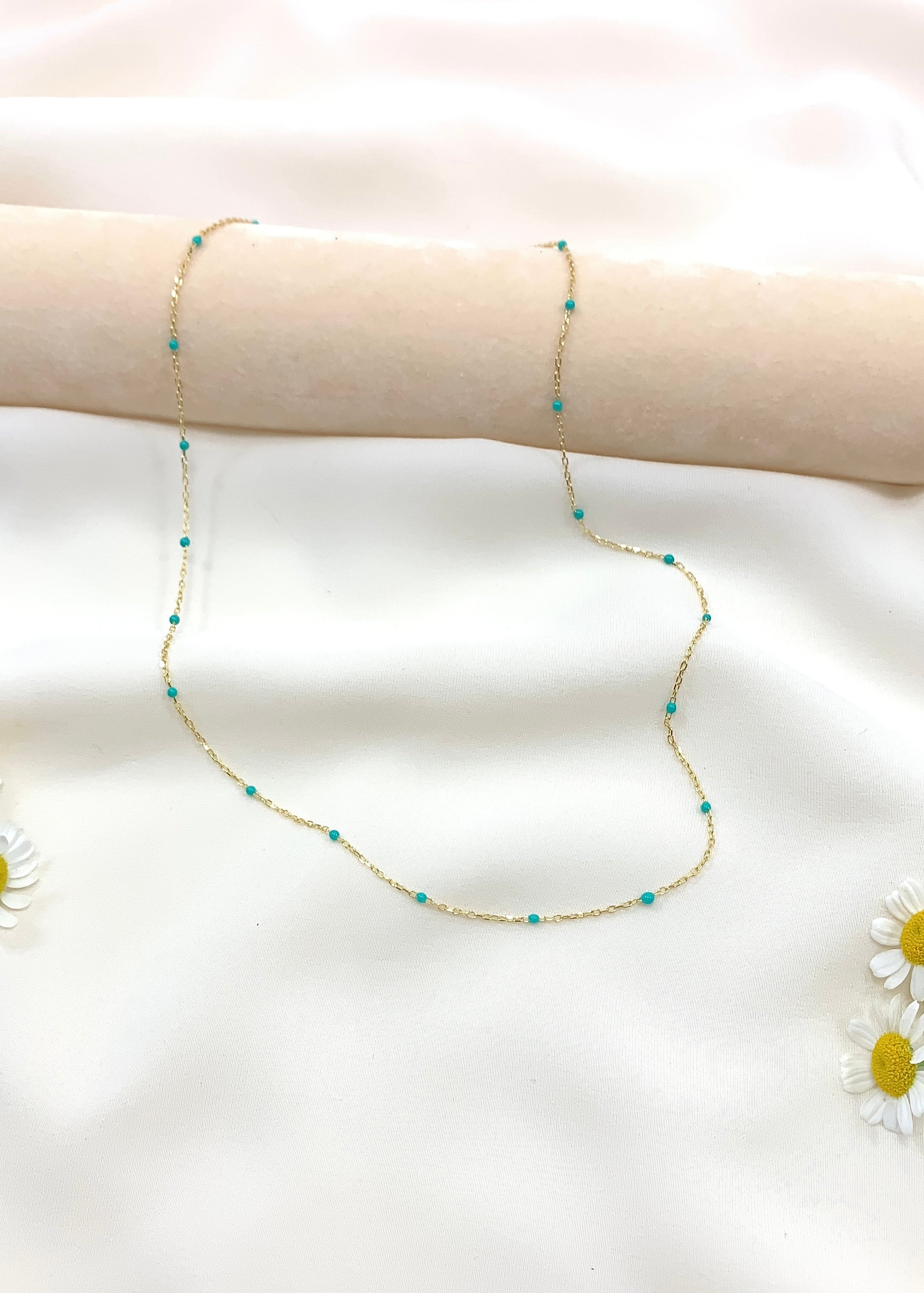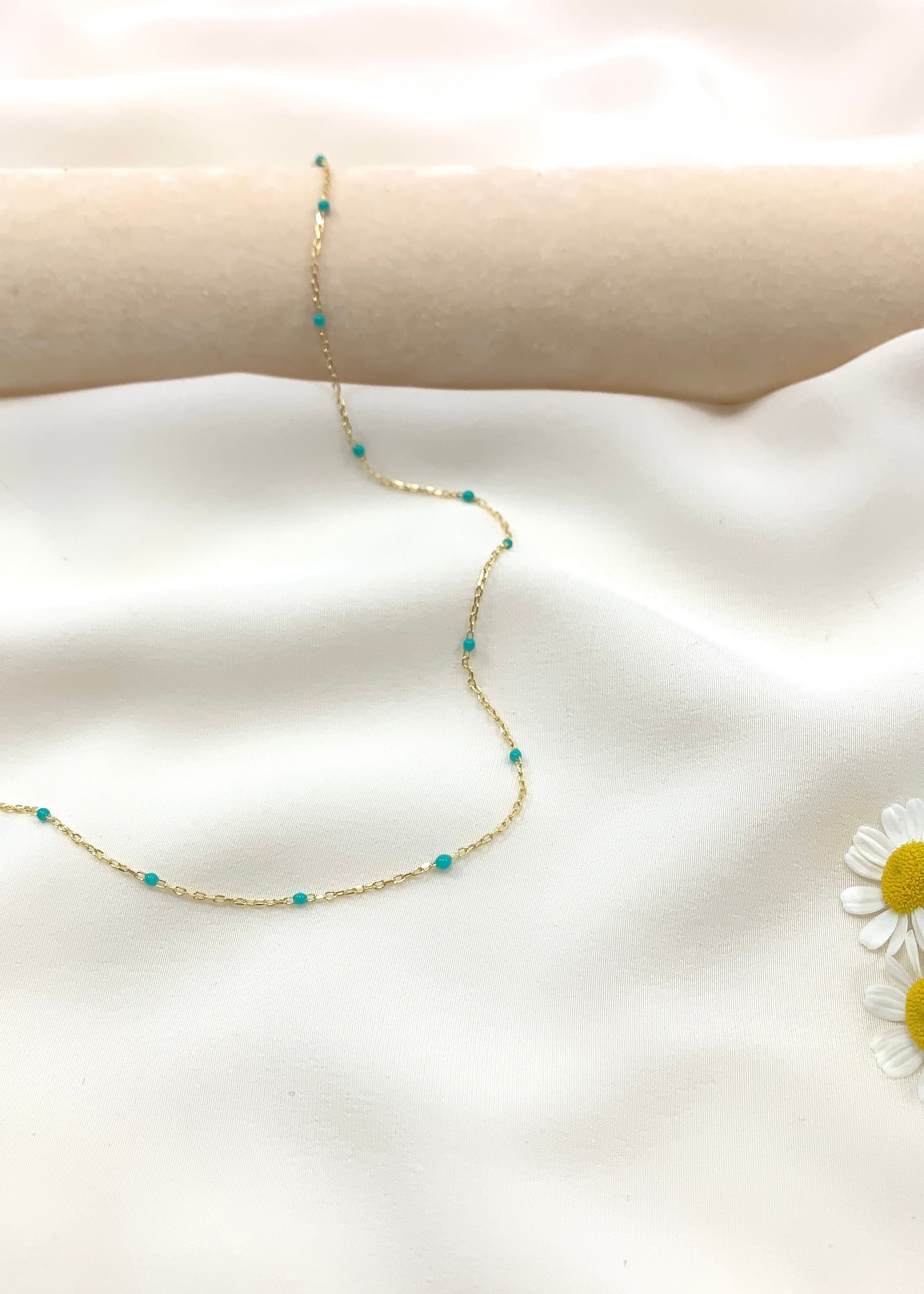 Το Blubop είναι μια διακριτική λεπτεπίλεπτη αλυσίδα που εκφράζει μινιμαλισμό και κομψότητα. Φτιαγμένη από ασήμι με επιχρύσωση, φέρει μικροσκοπικά τυρκουάζ micro-beads, διαμέτρου ενός χιλιοστού, τοποθετημένες με ακρίβεια ώστε να δημιουργούν μια καθαρή και φωτεινή γραμμή σε όλο το σύνολο.