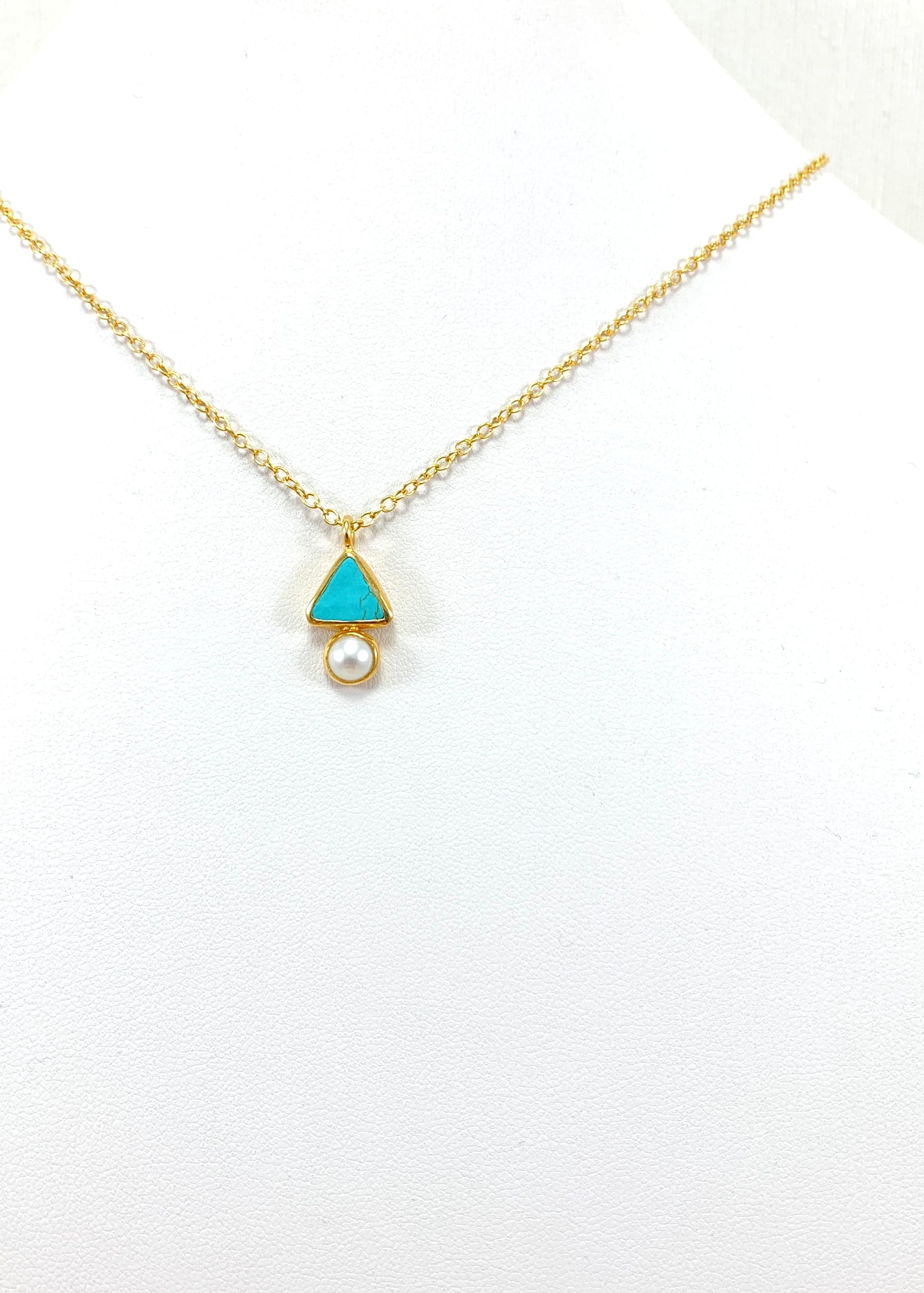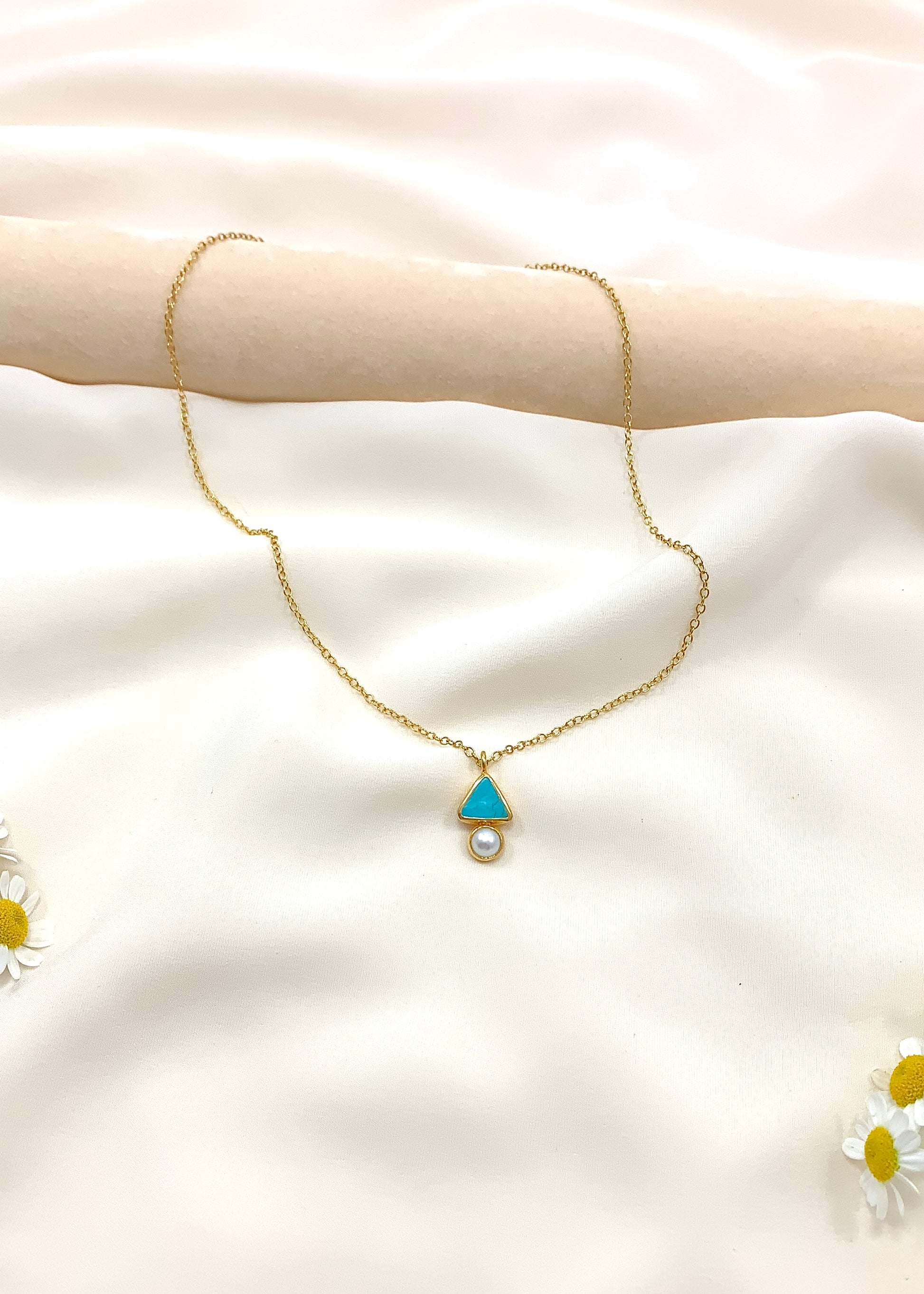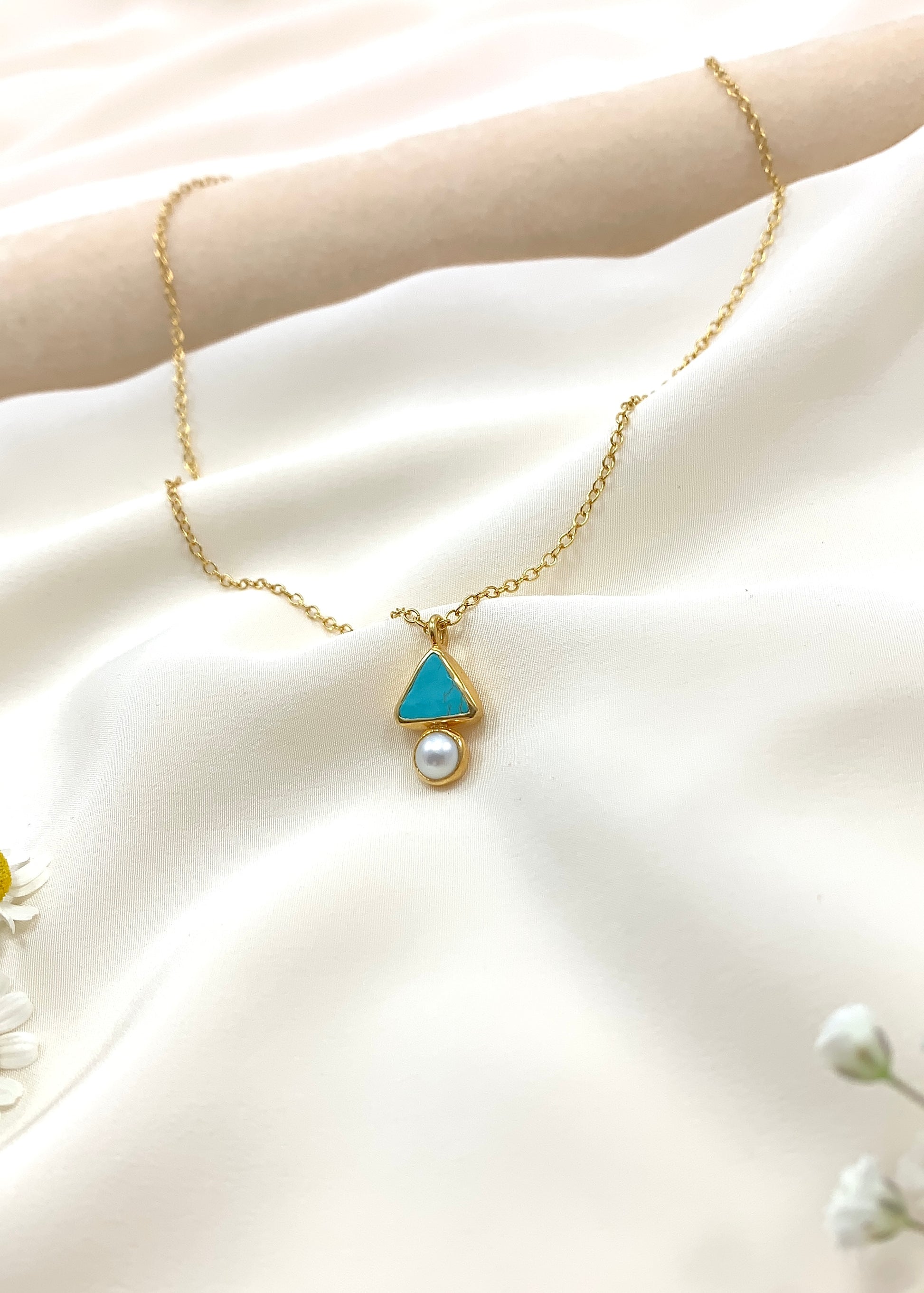 Το Calypso συνδυάζει την ένταση του τυρκουάζ με τη διαχρονική κομψότητα του μαργαριταριού σε μια σύνθεση που αποπνέει ισορροπία και αρμονία. Στην κορυφή τριγωνικός καμπουσόν από τυρκουάζ αναδεικνύει την καθαρότητα και το βάθος του μπλε και ακριβώς από κάτω στρογγυλό καστόνι φιλοξενεί φυσικό μαργαριτάρι προσδίδοντας απαλή λάμψη και αίσθηση ραφιναρισμένης υφής.