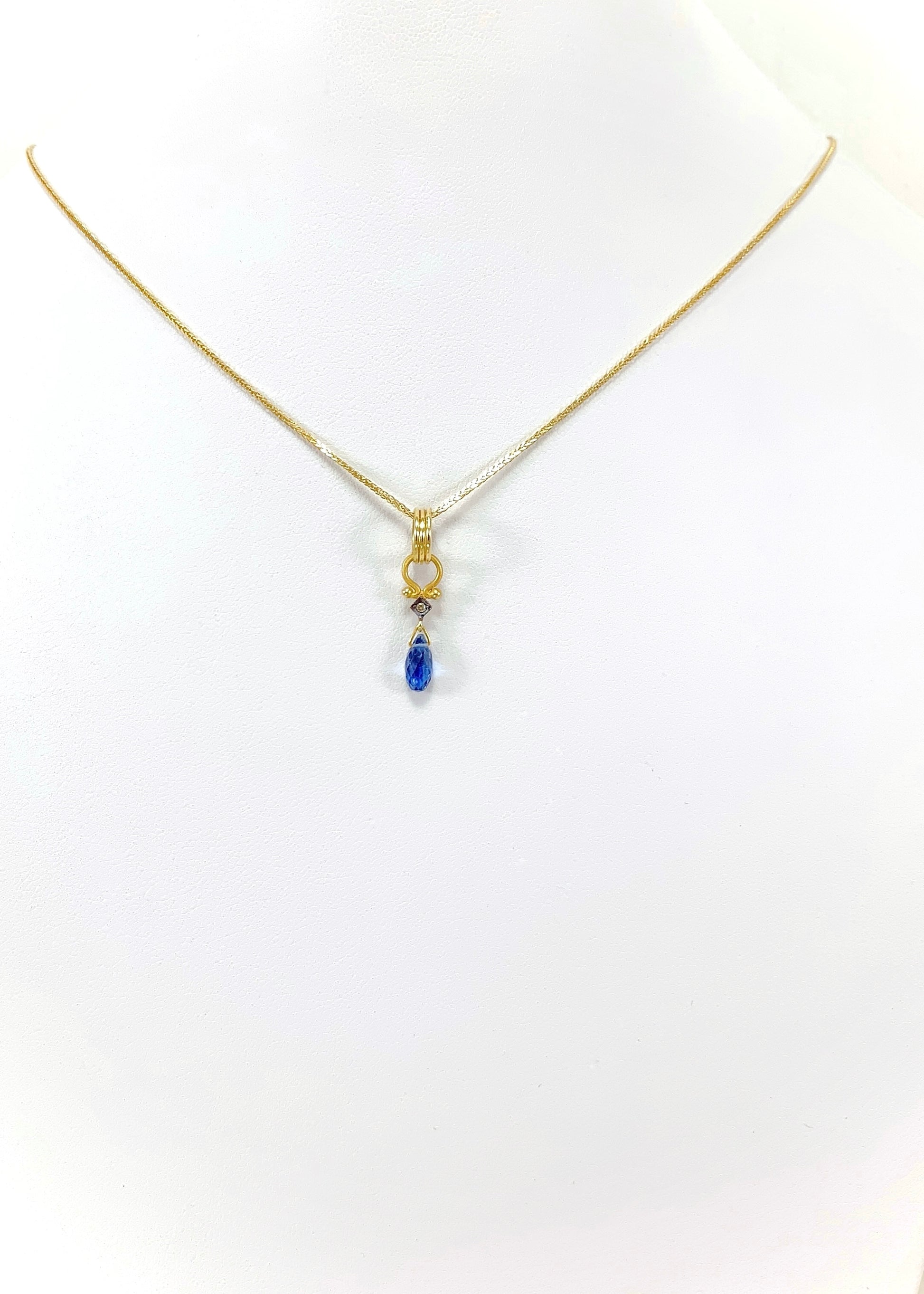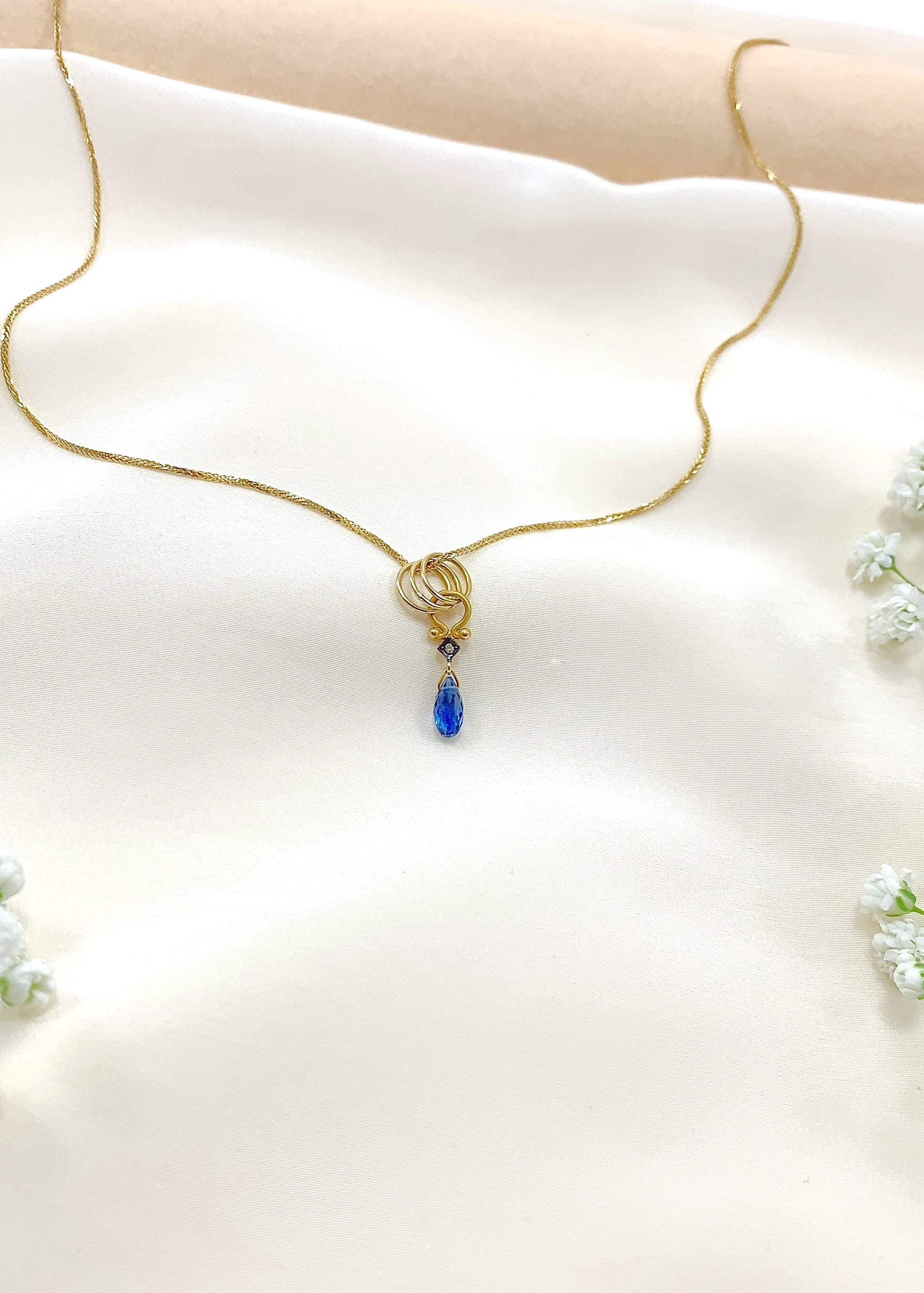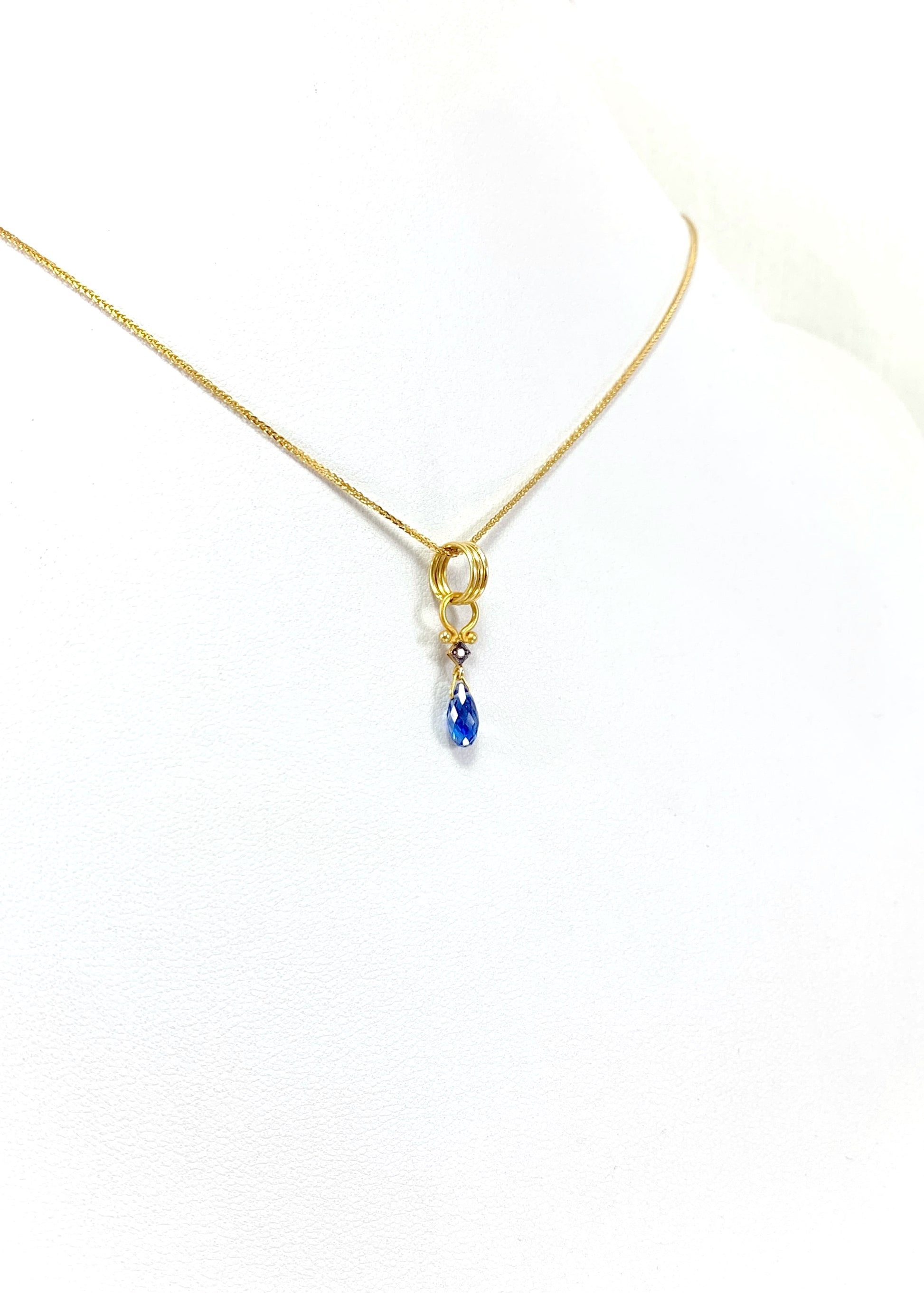 Στο επίκεντρο, το ζαφείρι κοπής marquise διατηρεί το πλούσιο, συμπαγές μπλε του με σταθερή οπτική απόδοση από κάθε γωνία. Λίγο παραπάνω, διαμάντι κοπής μπριγιάν σε τετράγωνο καστόνι προσθέτει διακριτική, καθαρή λάμψη και τεχνική αρτιότητα, ενισχύοντας την πολυτέλεια του συνόλου.