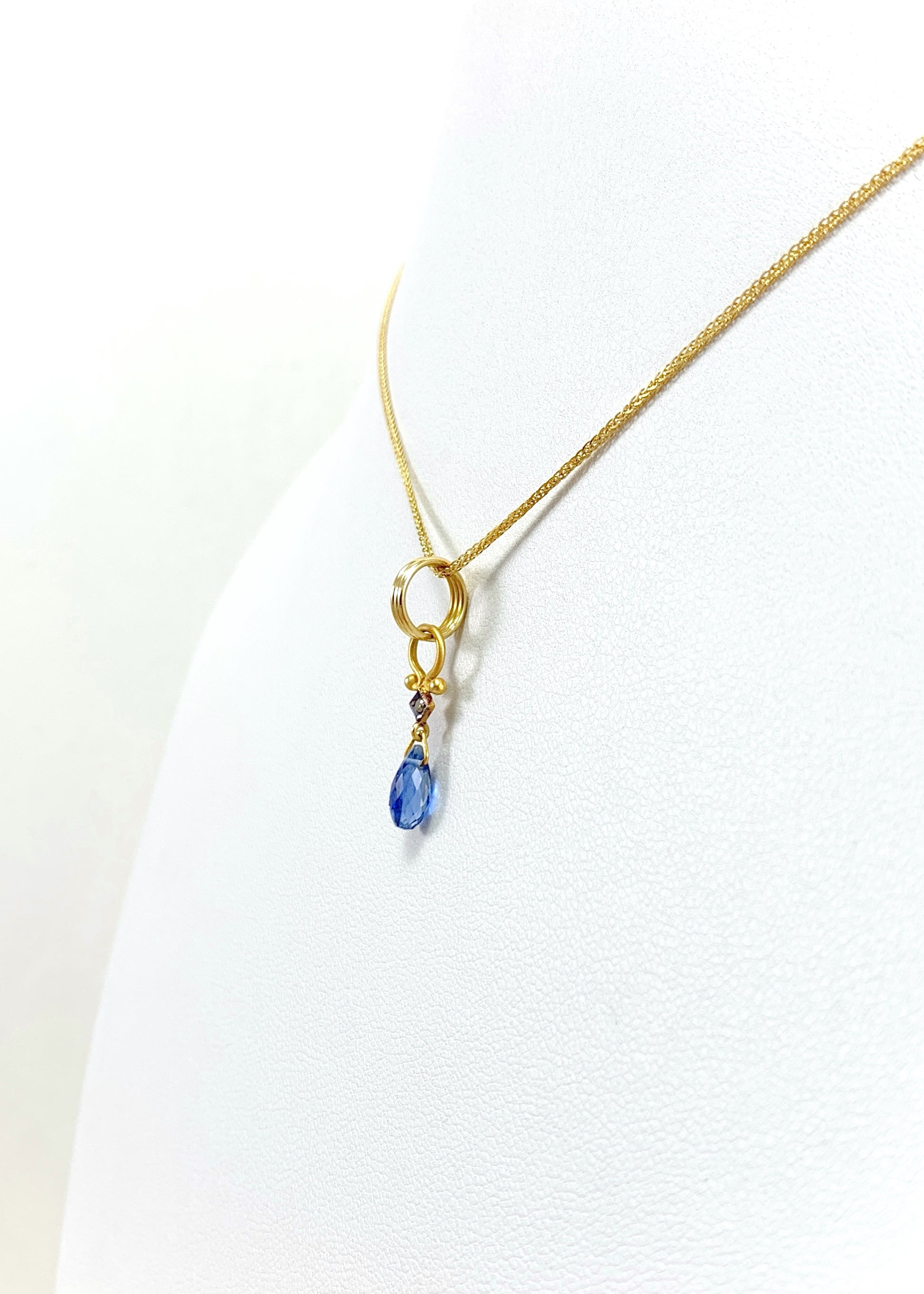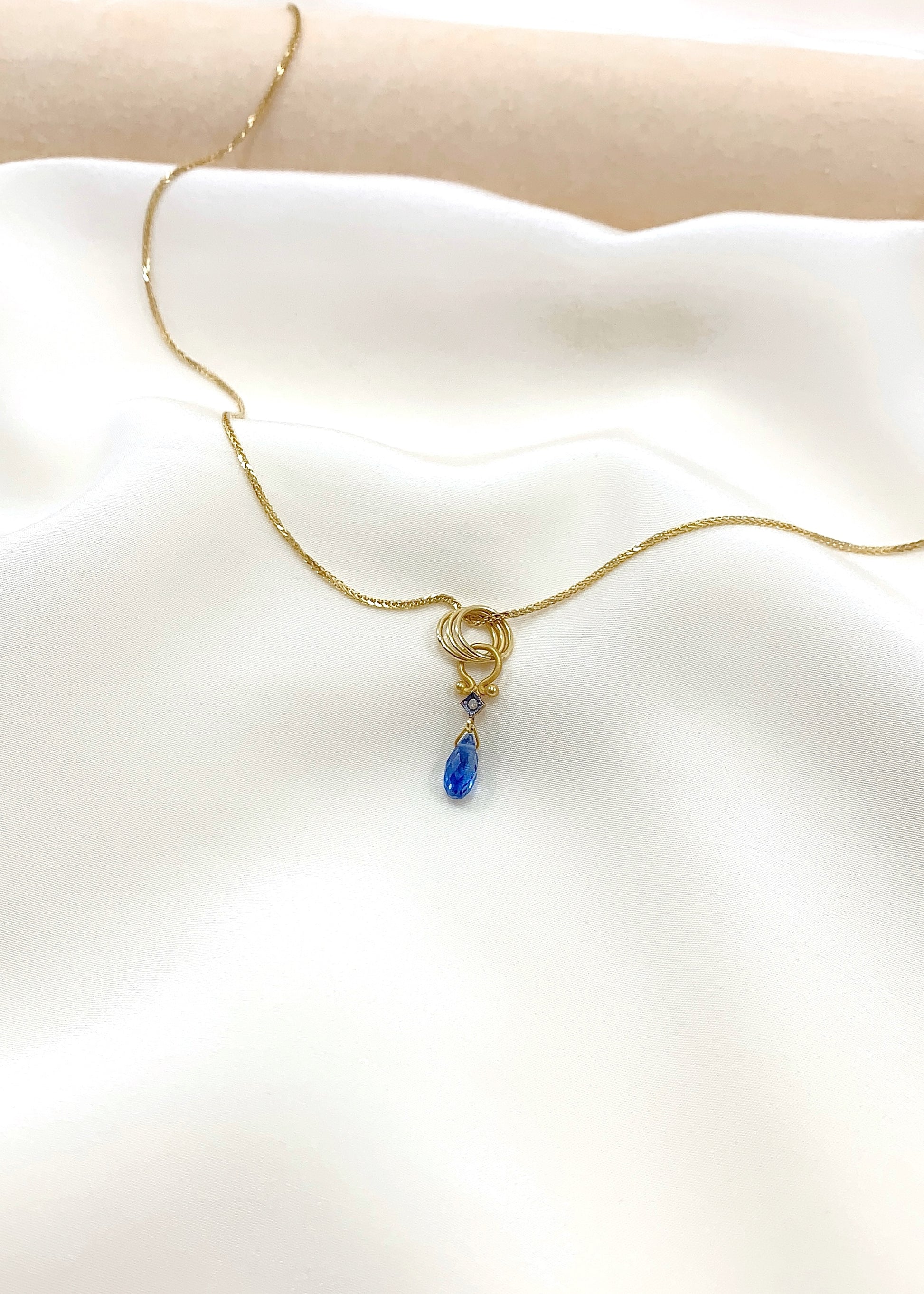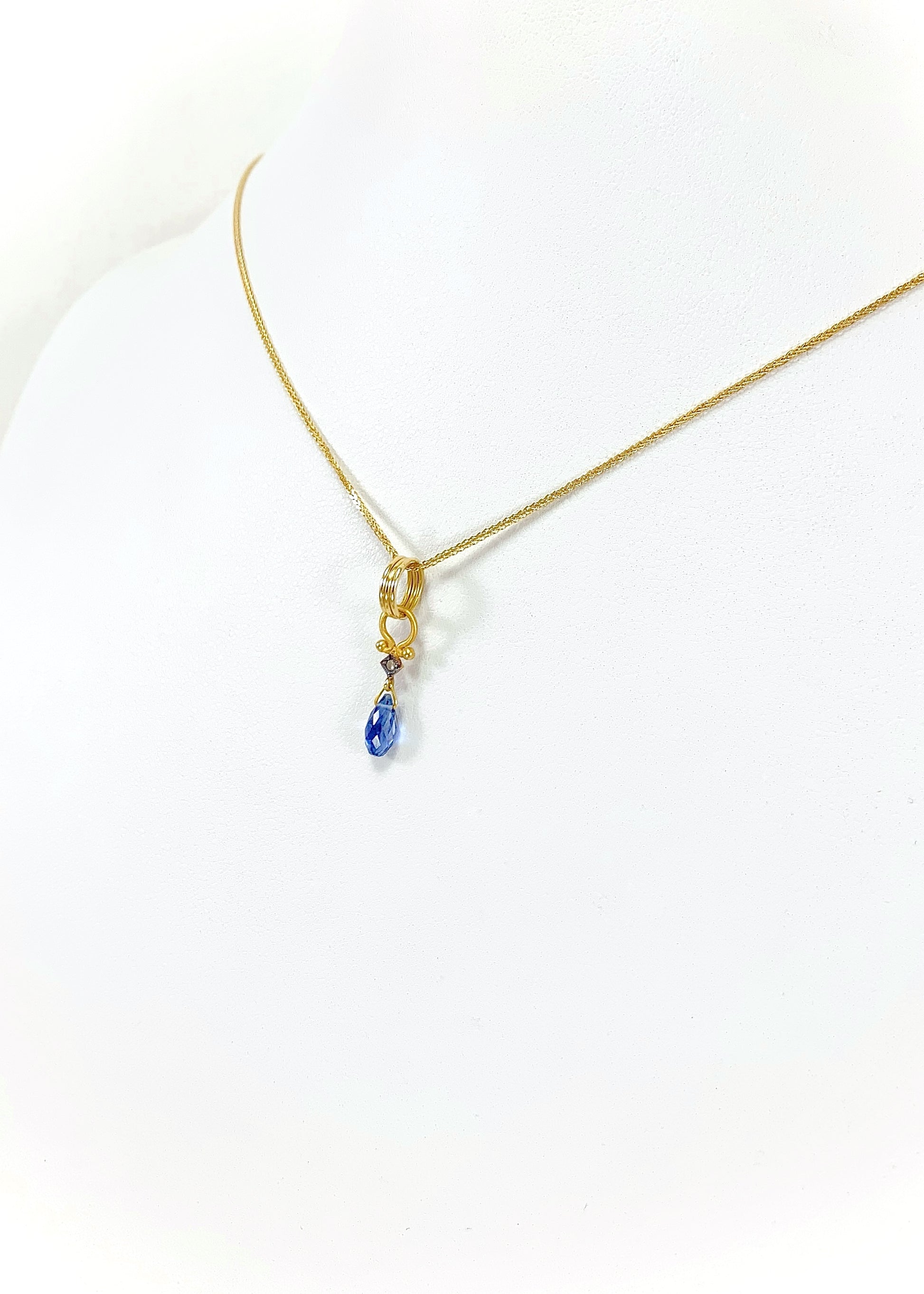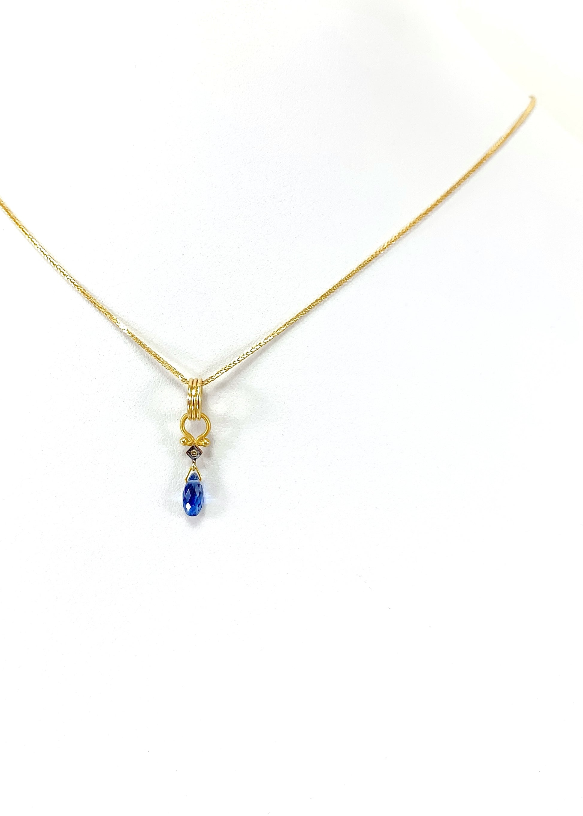Στο επίκεντρο, το ζαφείρι κοπής marquise διατηρεί το πλούσιο, συμπαγές μπλε του με σταθερή οπτική απόδοση από κάθε γωνία. Λίγο παραπάνω, διαμάντι κοπής μπριγιάν σε τετράγωνο καστόνι προσθέτει διακριτική, καθαρή λάμψη και τεχνική αρτιότητα, ενισχύοντας την πολυτέλεια του συνόλου.