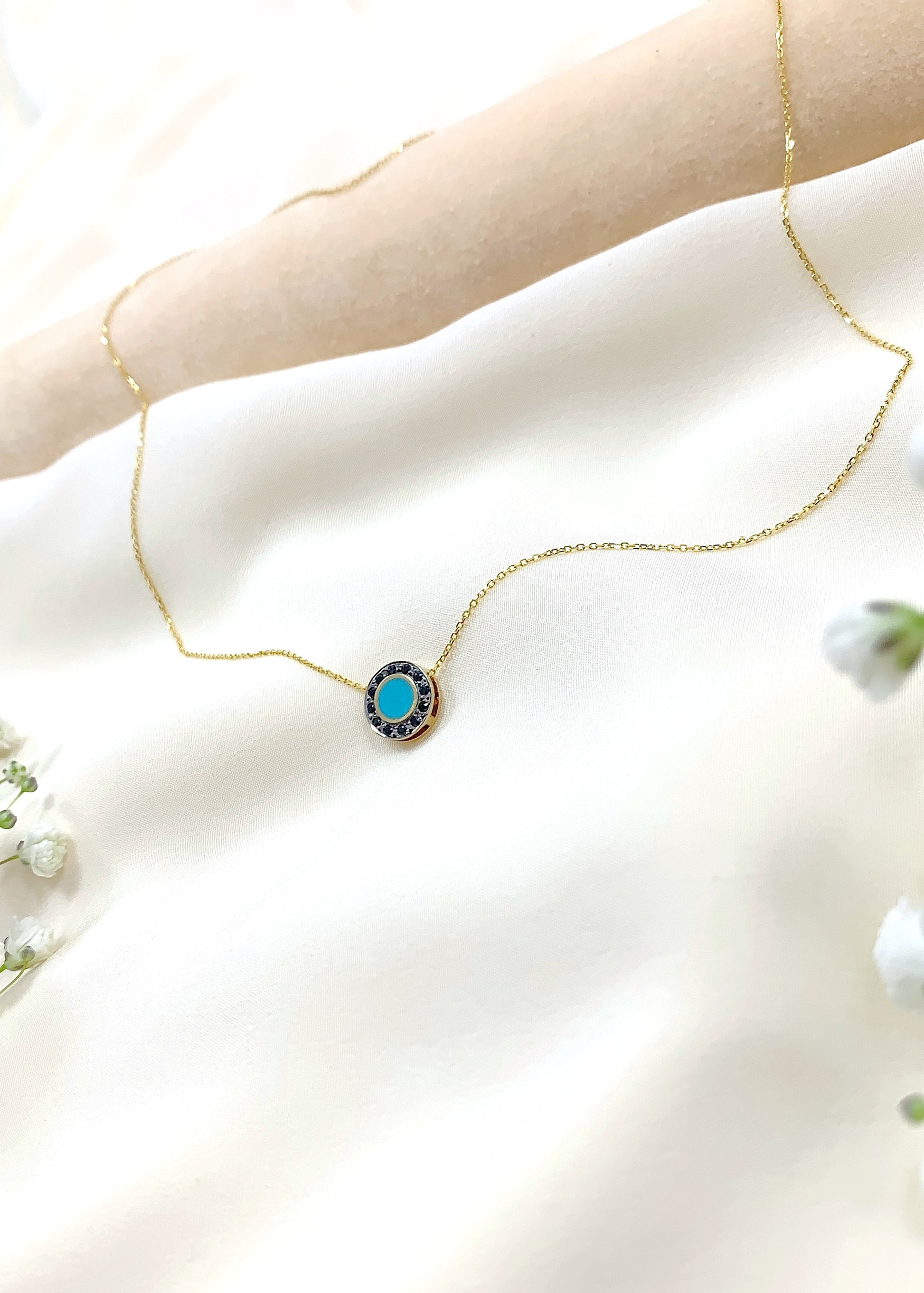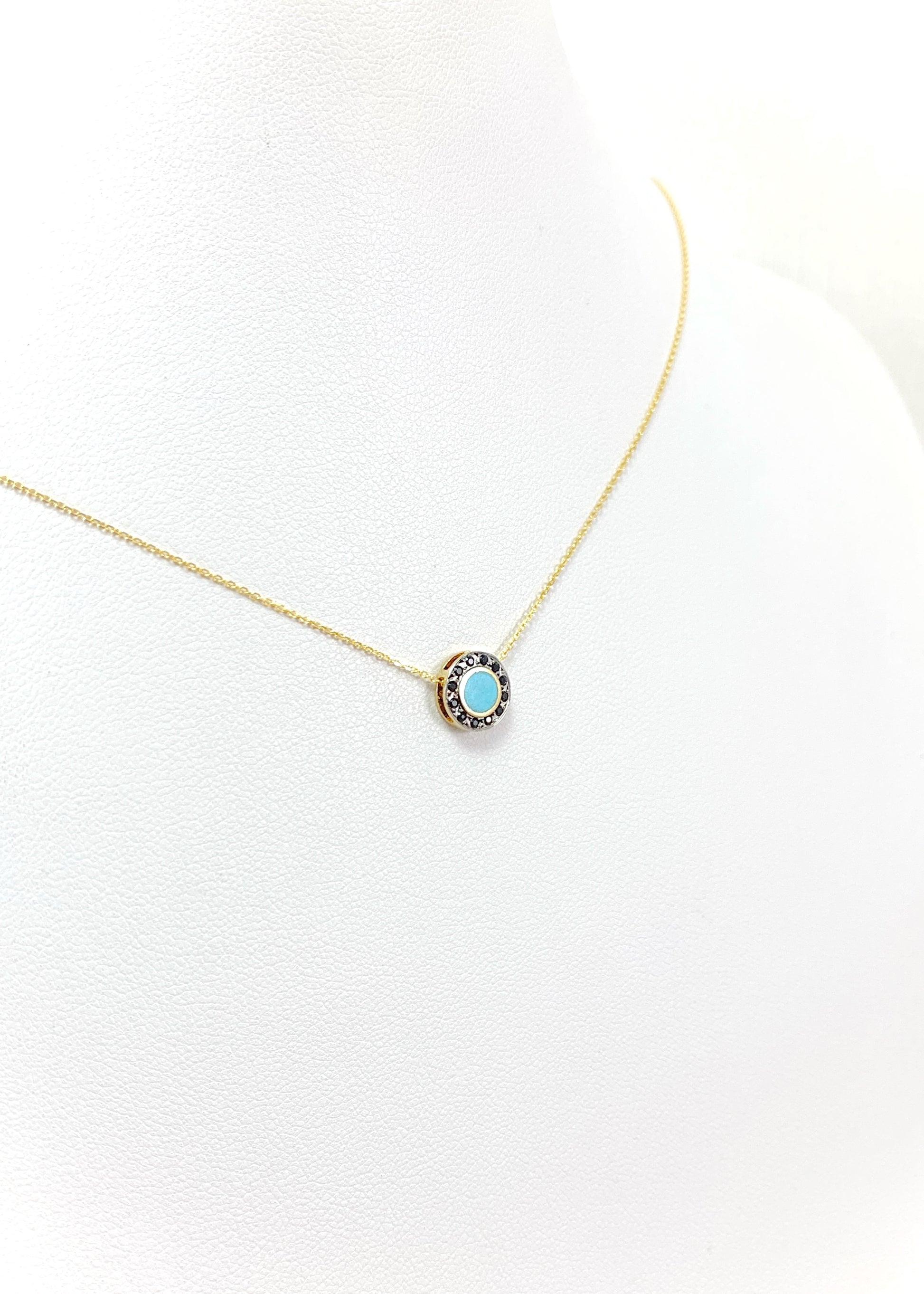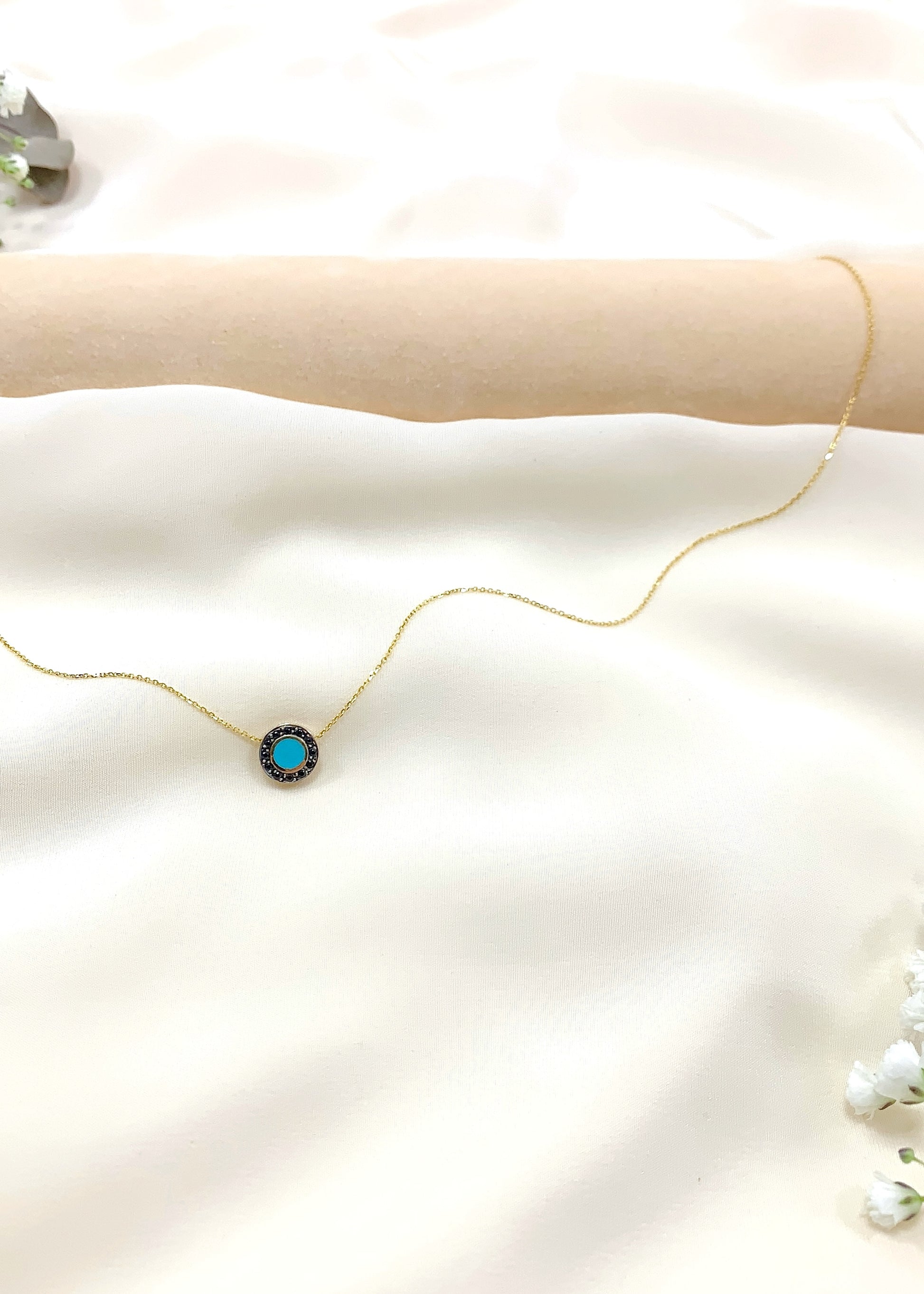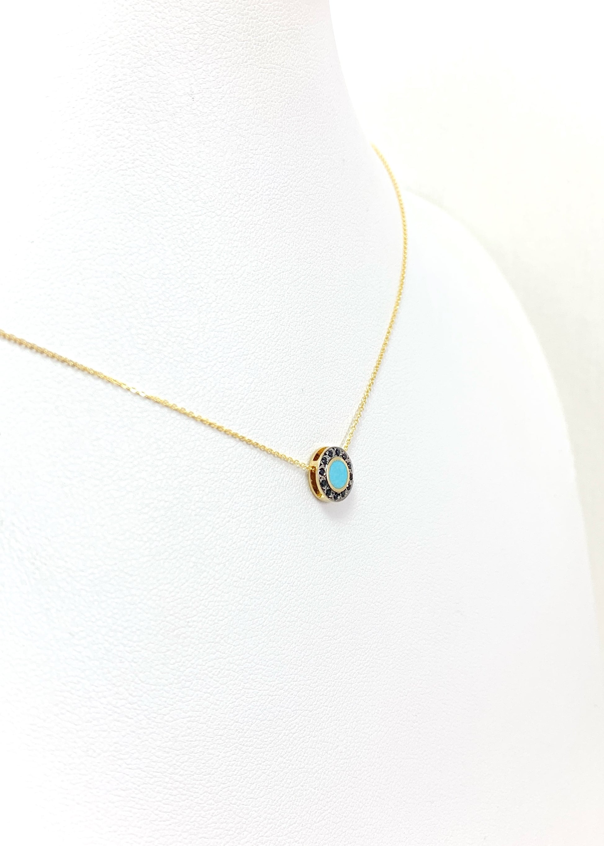 Το Odessa είναι από τα μενταγιόν που αποτυπώνει την αξία του μίνιμαλ σχεδιασμού σε γεωμετρική μορφή. Το στρογγυλό μοτίφ του φιλοξενεί κεντρικό καμπουσόν σε τυρκουάζ απόχρωση, με όσο χρειάζεται χρωματική ένταση και καθαρότητα στη γραμμή. Περιμετρικά, μαύρα ζιργκόν διαγράφουν περίγραμμα που αναδεικνύει την αντίθεση των τόνων και προβάλλει τον πυρήνα της σύνθεσης.