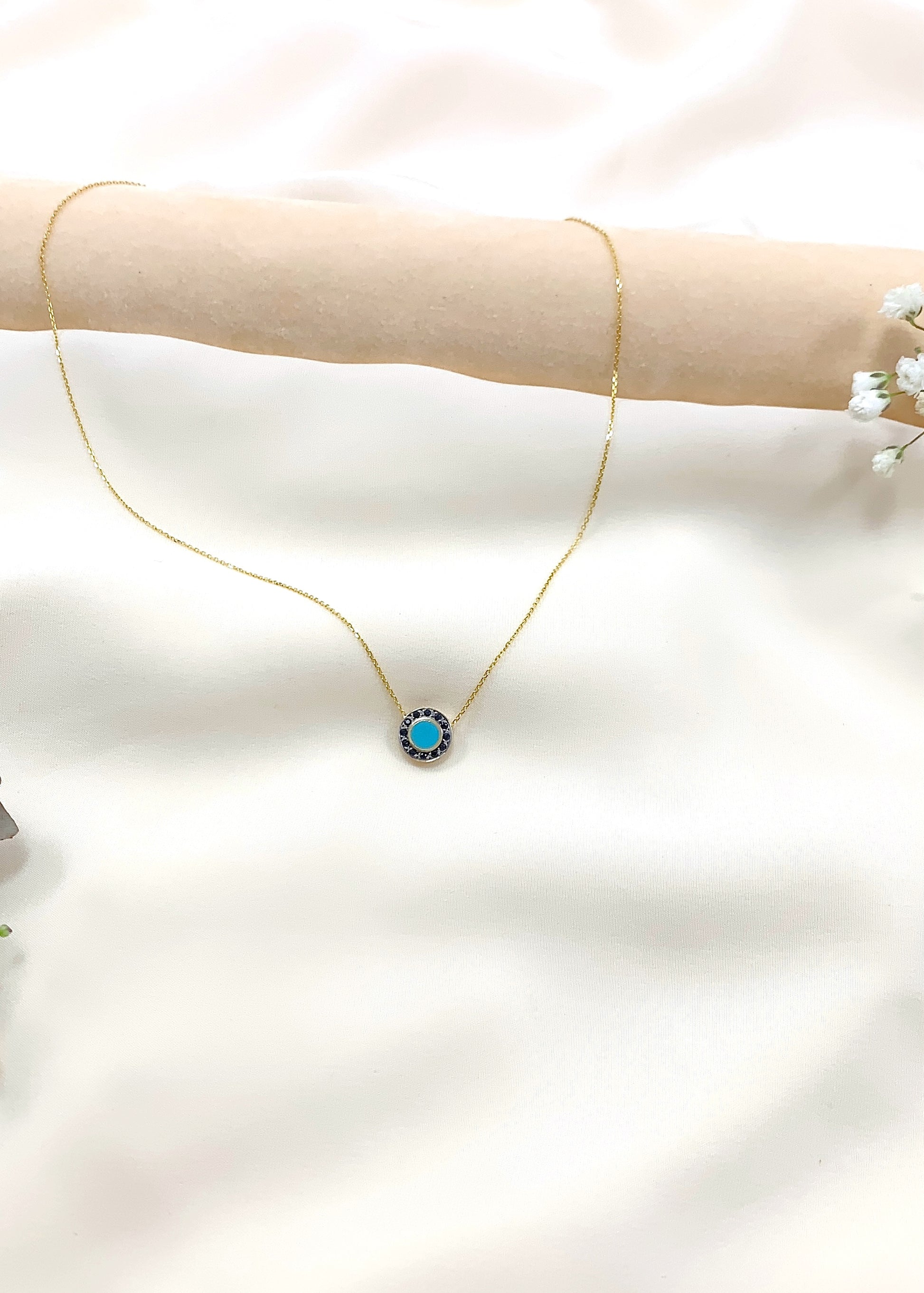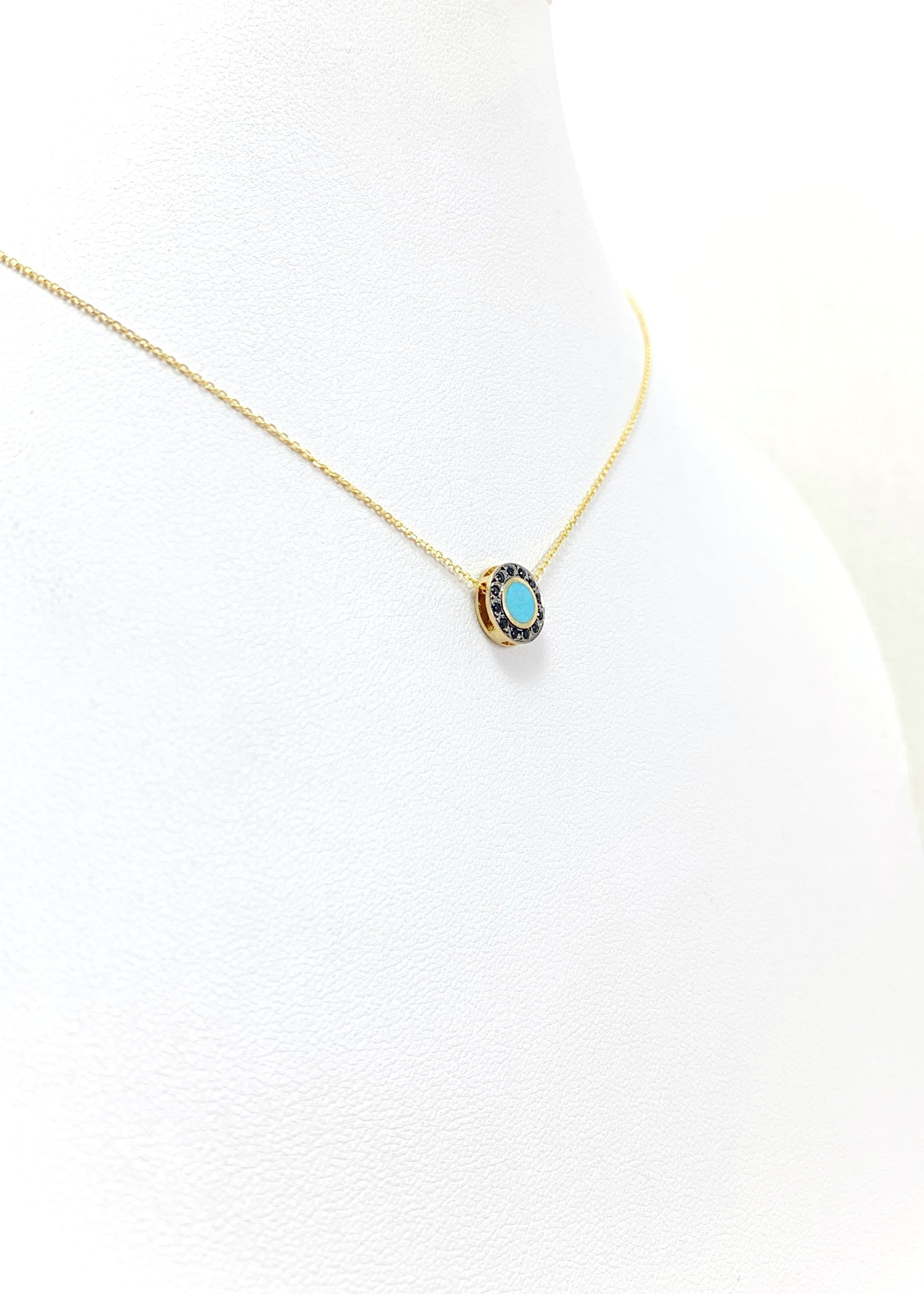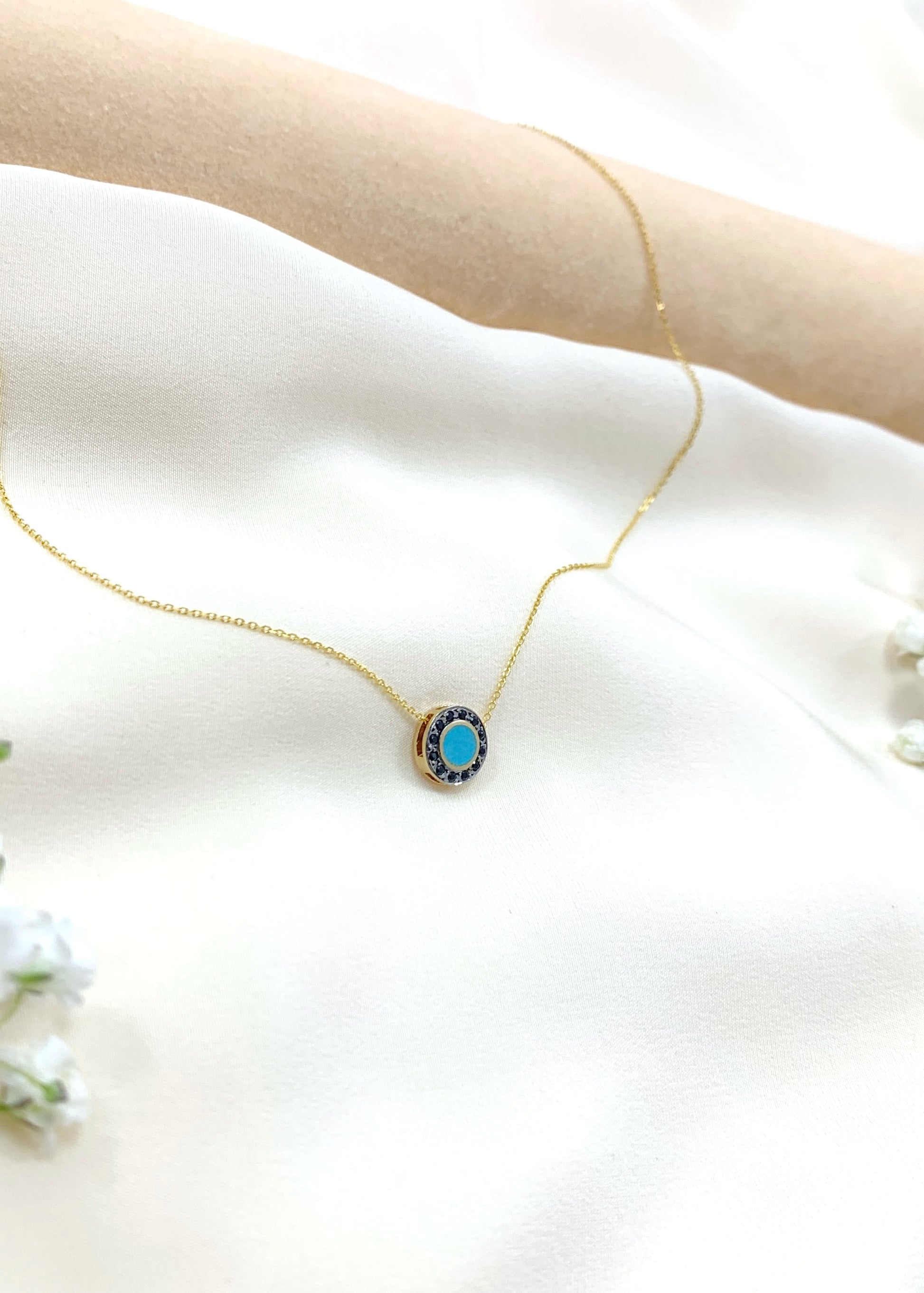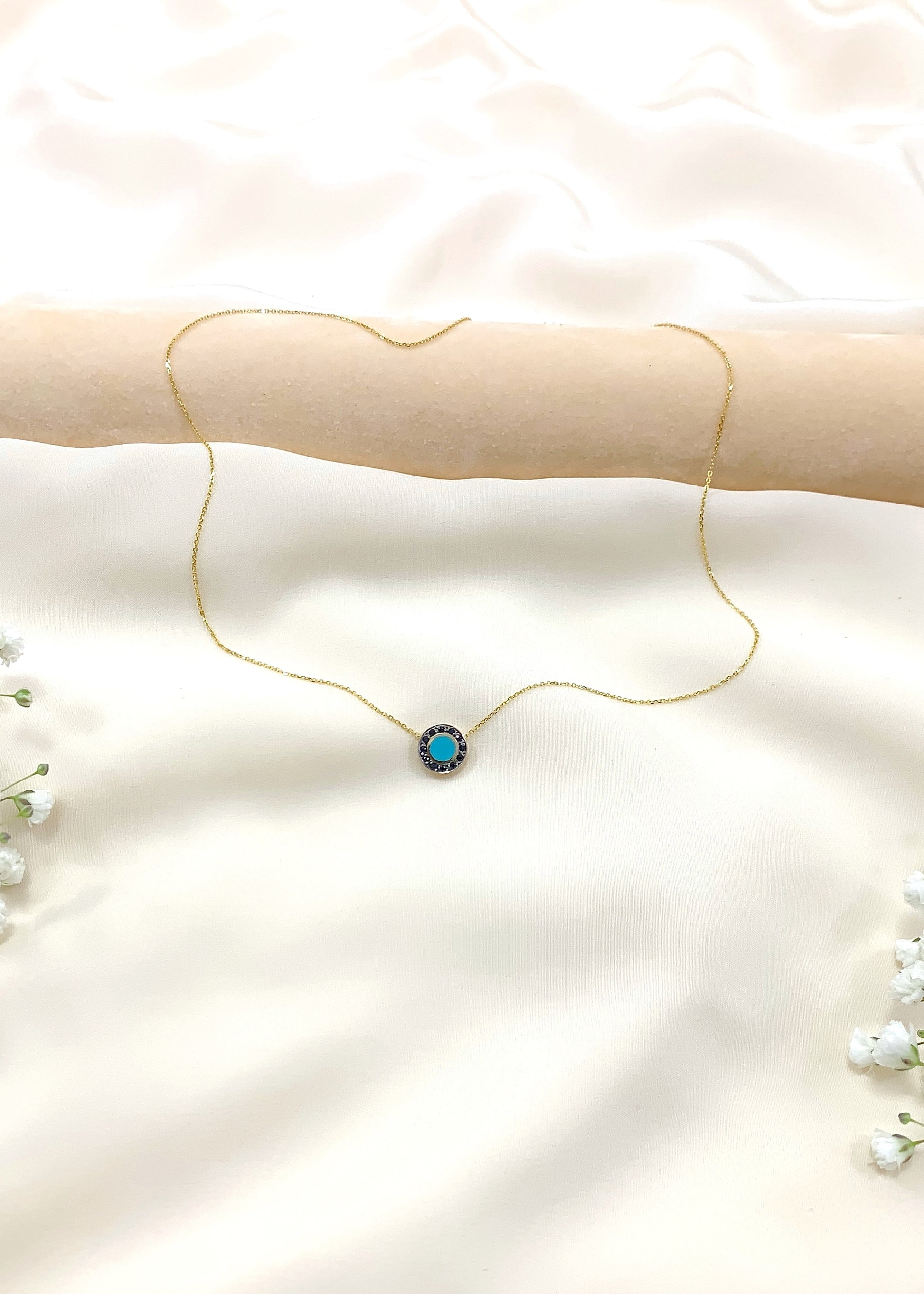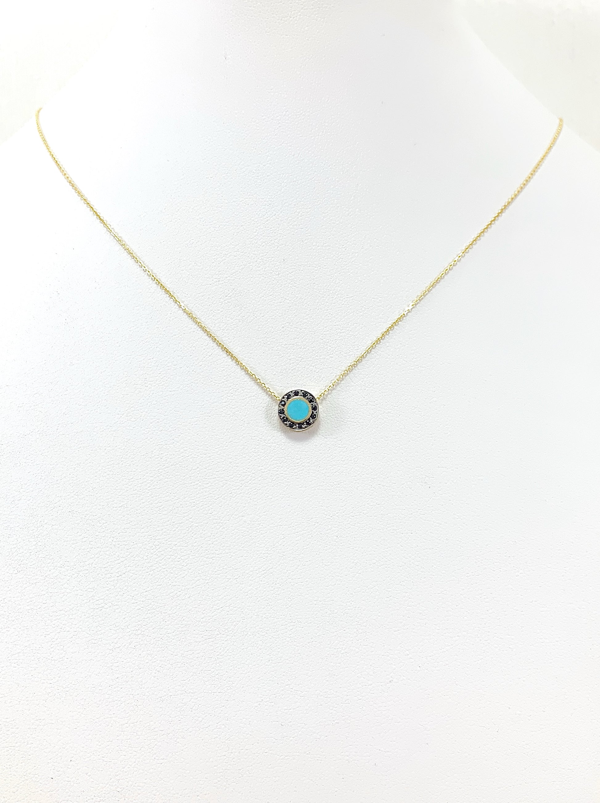 Το Odessa είναι από τα μενταγιόν που αποτυπώνει την αξία του μίνιμαλ σχεδιασμού σε γεωμετρική μορφή. Το στρογγυλό μοτίφ του φιλοξενεί κεντρικό καμπουσόν σε τυρκουάζ απόχρωση, με όσο χρειάζεται χρωματική ένταση και καθαρότητα στη γραμμή. Περιμετρικά, μαύρα ζιργκόν διαγράφουν περίγραμμα που αναδεικνύει την αντίθεση των τόνων και προβάλλει τον πυρήνα της σύνθεσης.