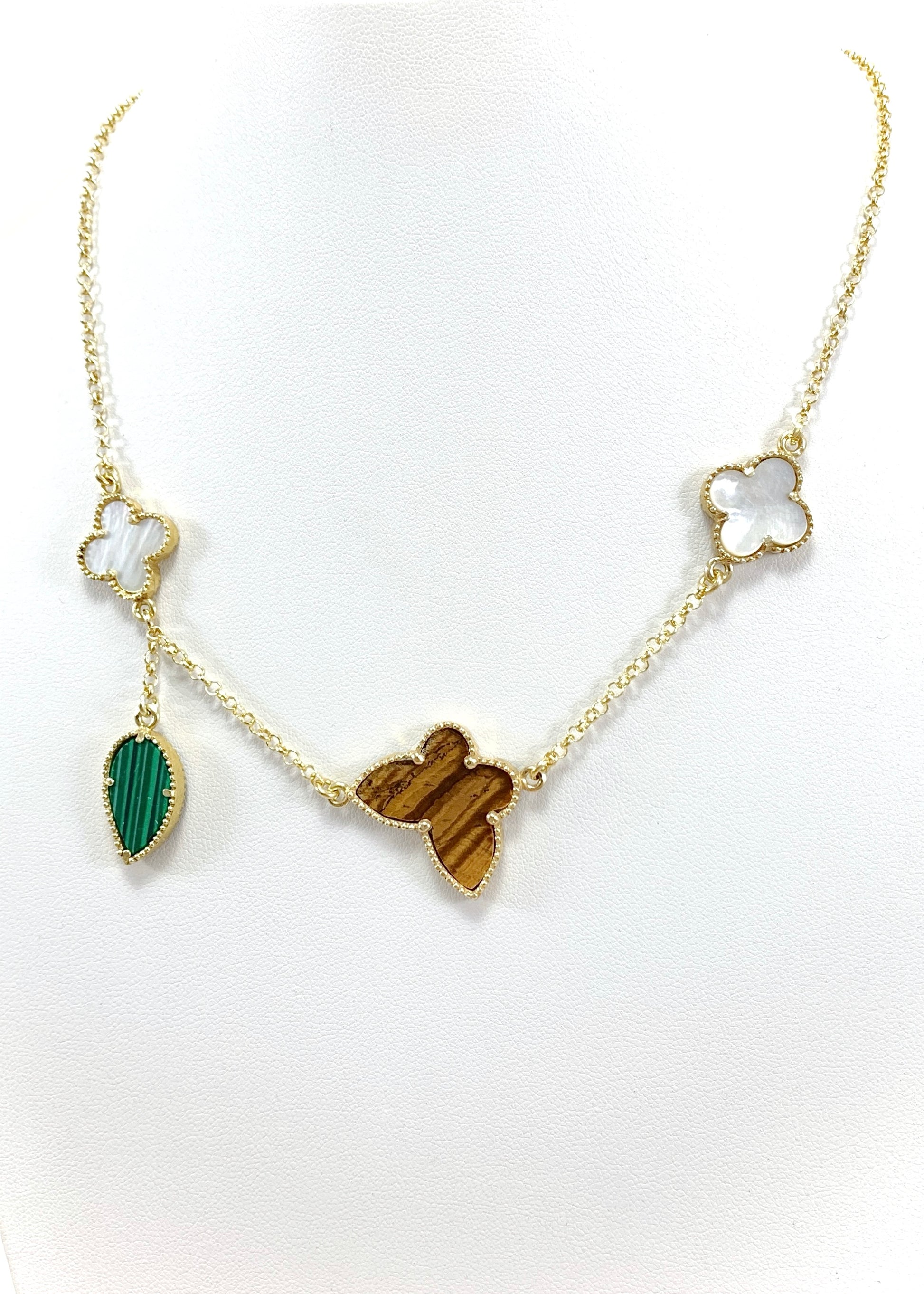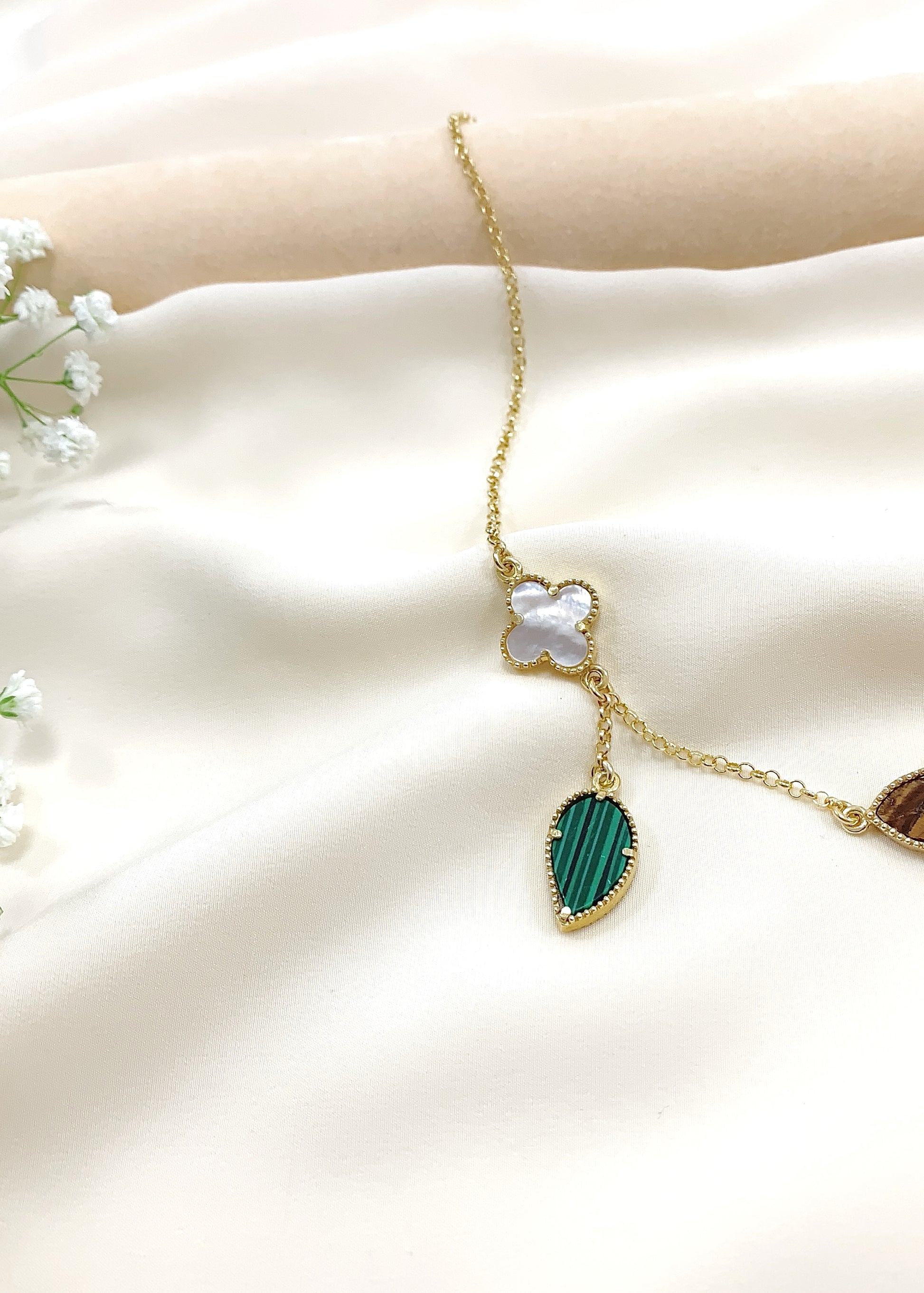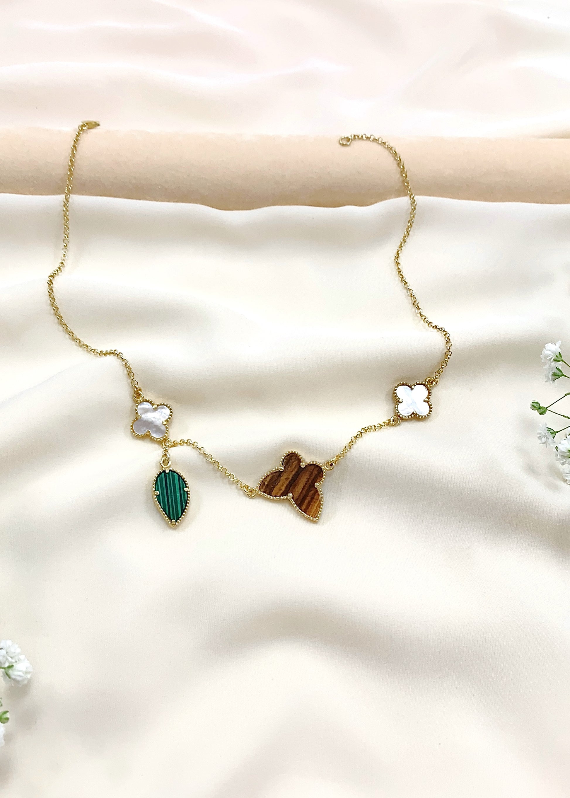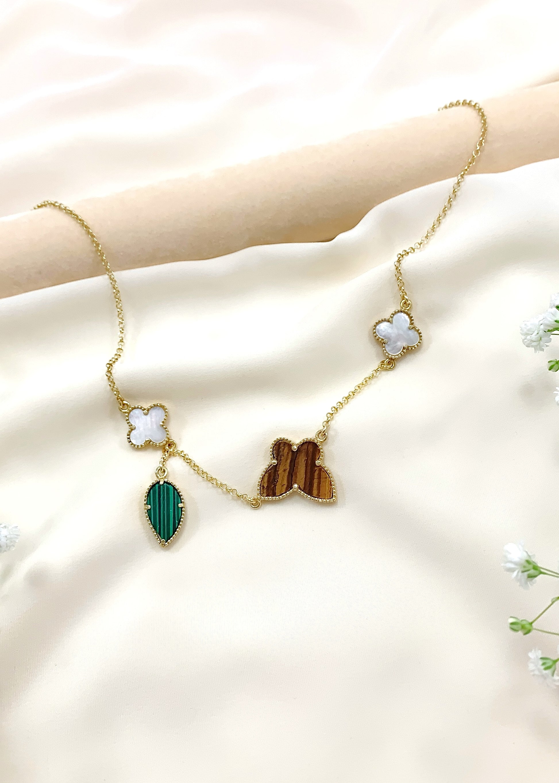 Το Verona φέρνει κοντά τρεις φυσικούς λίθους, τοποθετημένους σε μια αλυσίδα από επιχρυσωμένο ασήμι 925, μήκους 44 εκ. Στο κέντρο, το Μάτι Τίγρης αποκαλύπτει τις χαρακτηριστικές χρυσοκαφέ αντανακλάσεις του, ζωντανές σε κάθε κίνηση. Δεξιά και αριστερά, δύο τετράφυλλα από φίλντισι προσφέρουν απαλούς, κρεμ τόνους με φωτεινό ιριδισμό. Στο τελείωμα, ο μαλαχίτης, με τις πράσινες ζώνες του, υπογράφει τη σύνθεση με βάθος και χαρακτήρα.