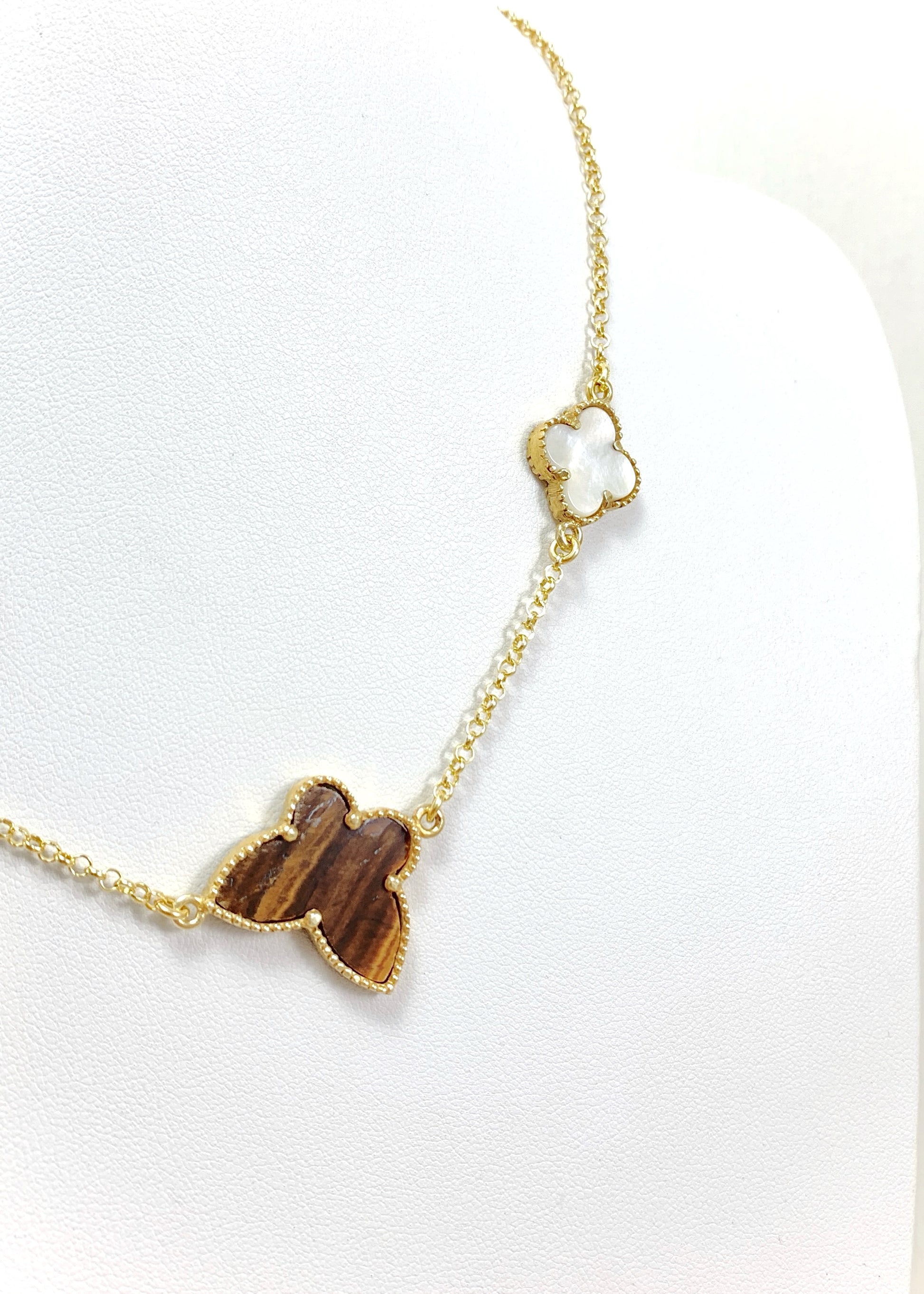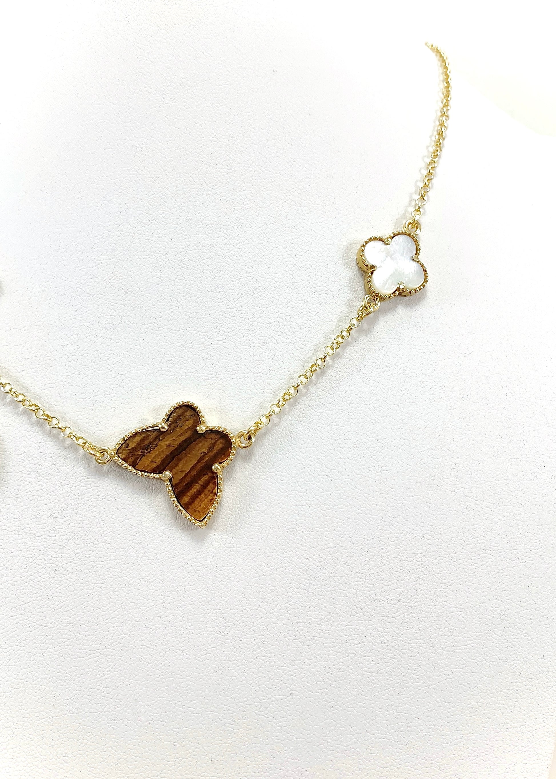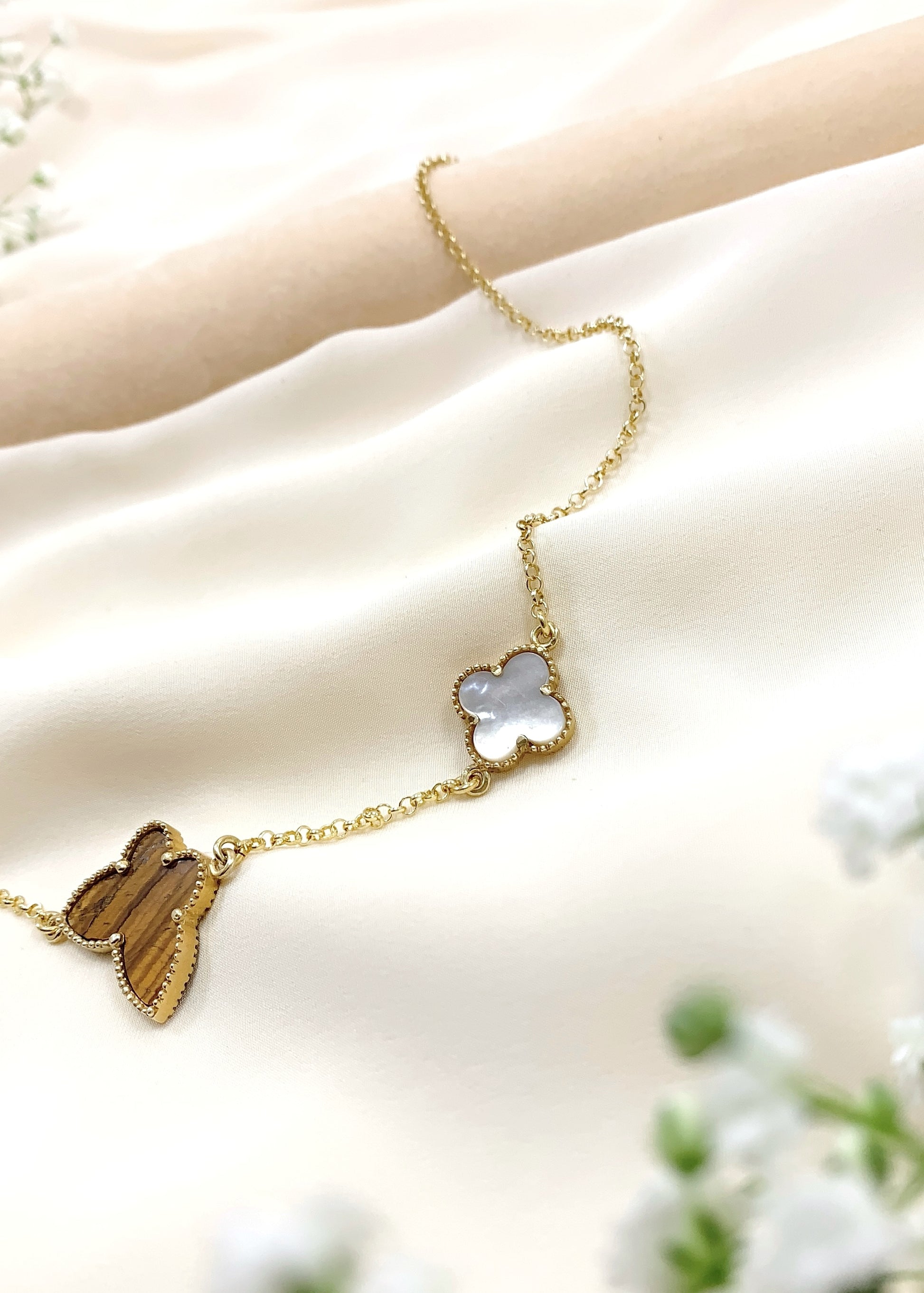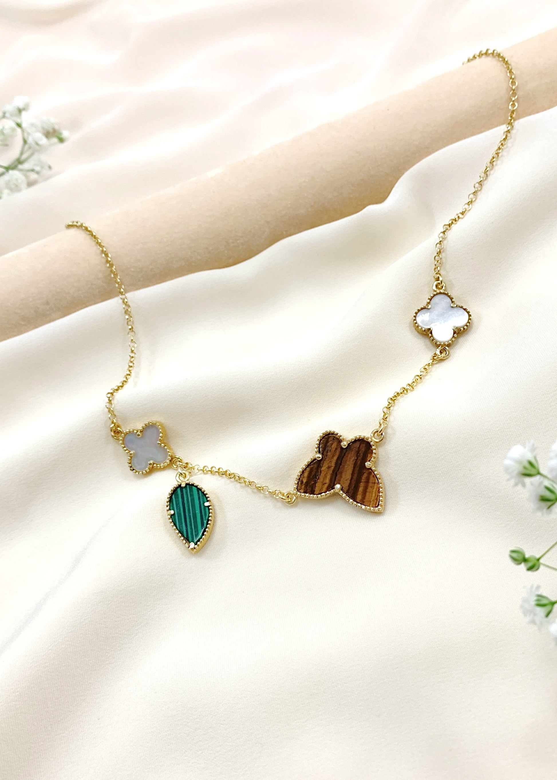 Το Verona φέρνει κοντά τρεις φυσικούς λίθους, τοποθετημένους σε μια αλυσίδα από επιχρυσωμένο ασήμι 925, μήκους 44 εκ. Στο κέντρο, το Μάτι Τίγρης αποκαλύπτει τις χαρακτηριστικές χρυσοκαφέ αντανακλάσεις του, ζωντανές σε κάθε κίνηση. Δεξιά και αριστερά, δύο τετράφυλλα από φίλντισι προσφέρουν απαλούς, κρεμ τόνους με φωτεινό ιριδισμό. Στο τελείωμα, ο μαλαχίτης, με τις πράσινες ζώνες του, υπογράφει τη σύνθεση με βάθος και χαρακτήρα.